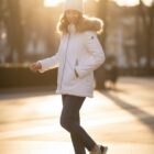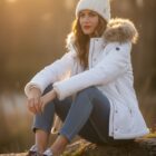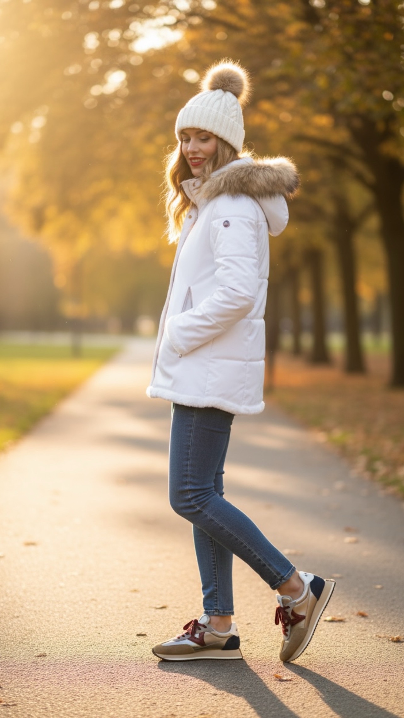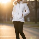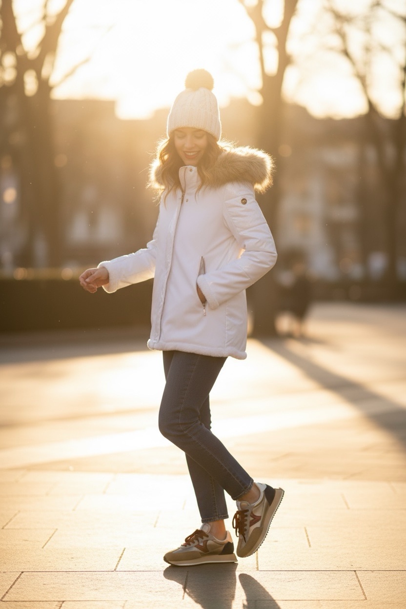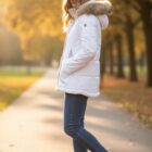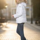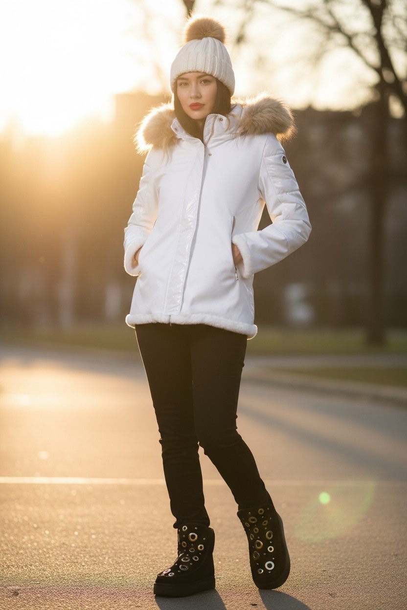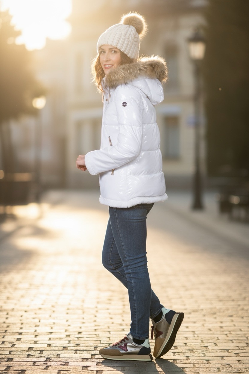 Plumas blanco acolchado con relleno sintético. Gorro con pelo natural.