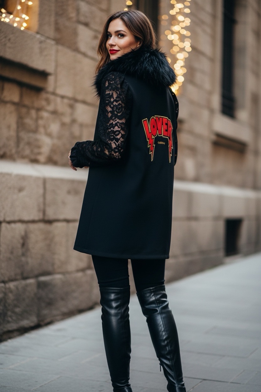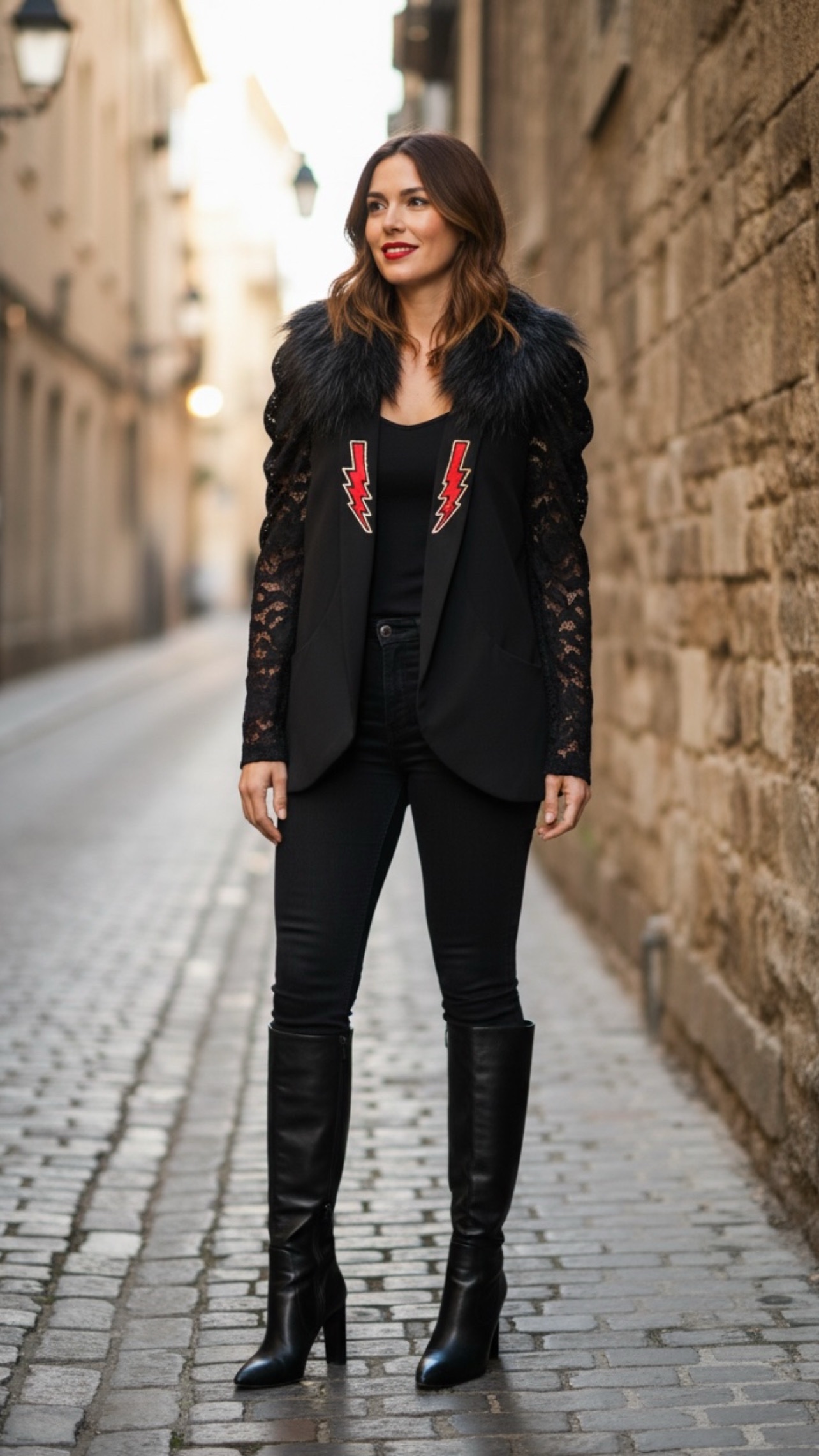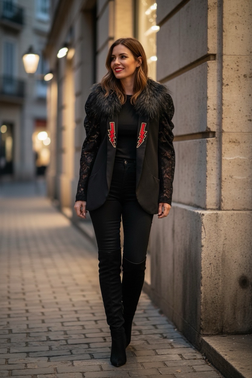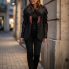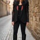 Blazer corte smoking, forro interior en rojo, con hombreras y con bolsillos. Manga Larga. Detalle en la solapa y en la espalda. Las mangas son de encaje.
