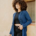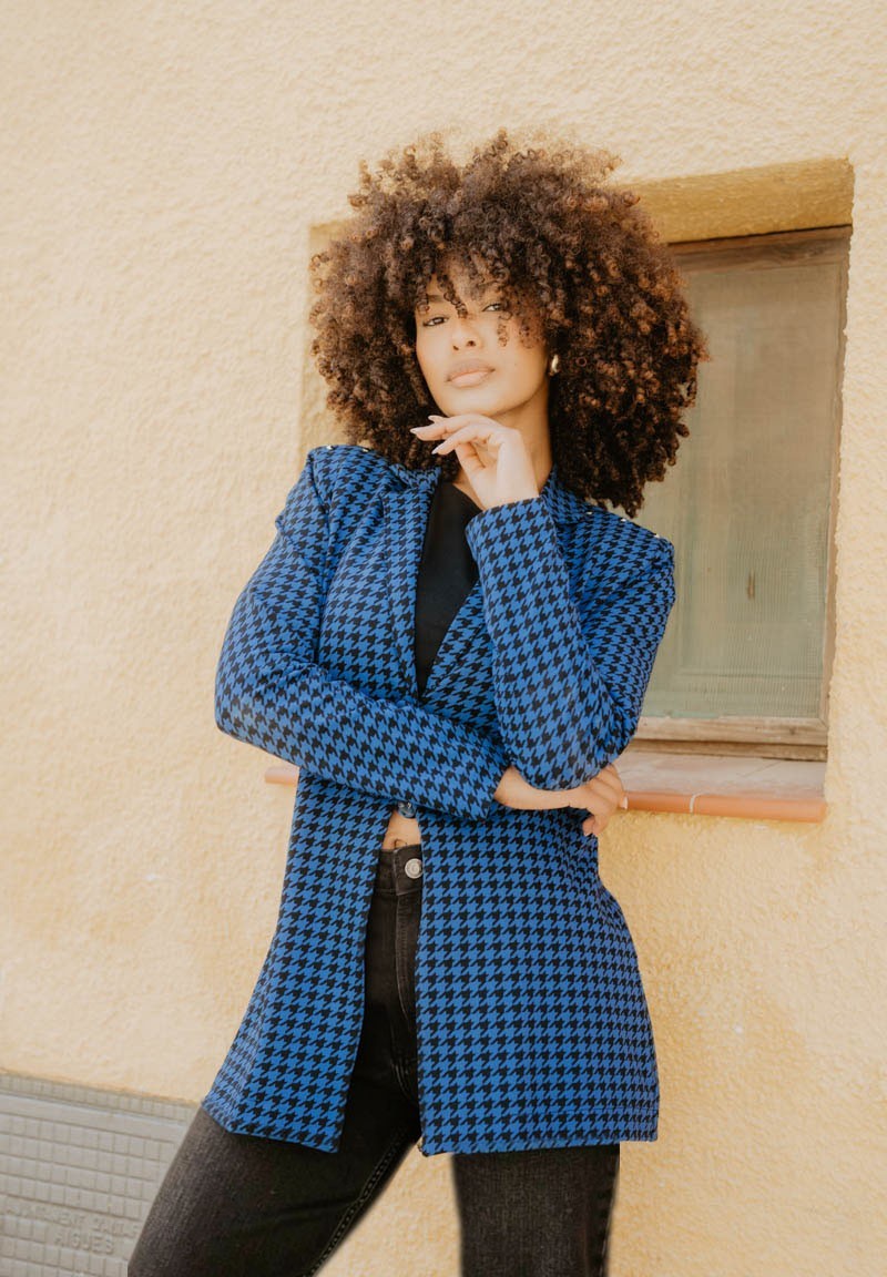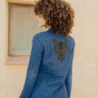 Americana con tachuelas en los hombros. Azul con estampado de pata de gallo. Lleva en la espalda una pantera negra en una tela superpuesta, bordada en su contorno. Los ojos son bordados y una hilera de tachuelas forma la estructura interna.