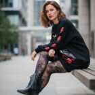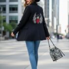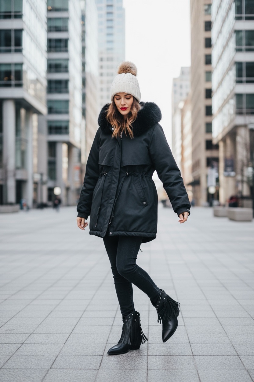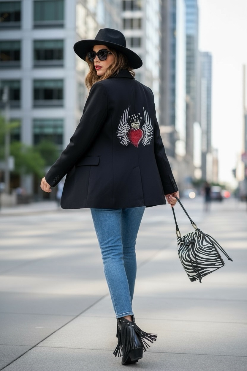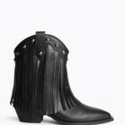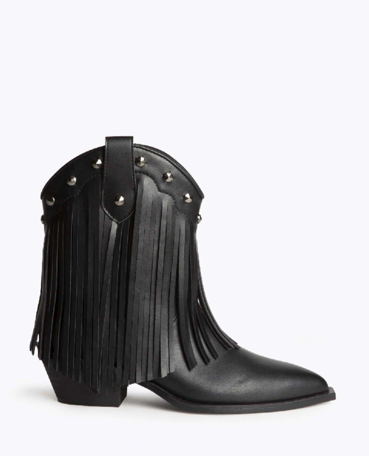 Botín de tacón medio, estilo cowboy. Cremallera en el lateral. Detalle de flecos largos en la caña; tachas en la parte superior. Acabado en punta.