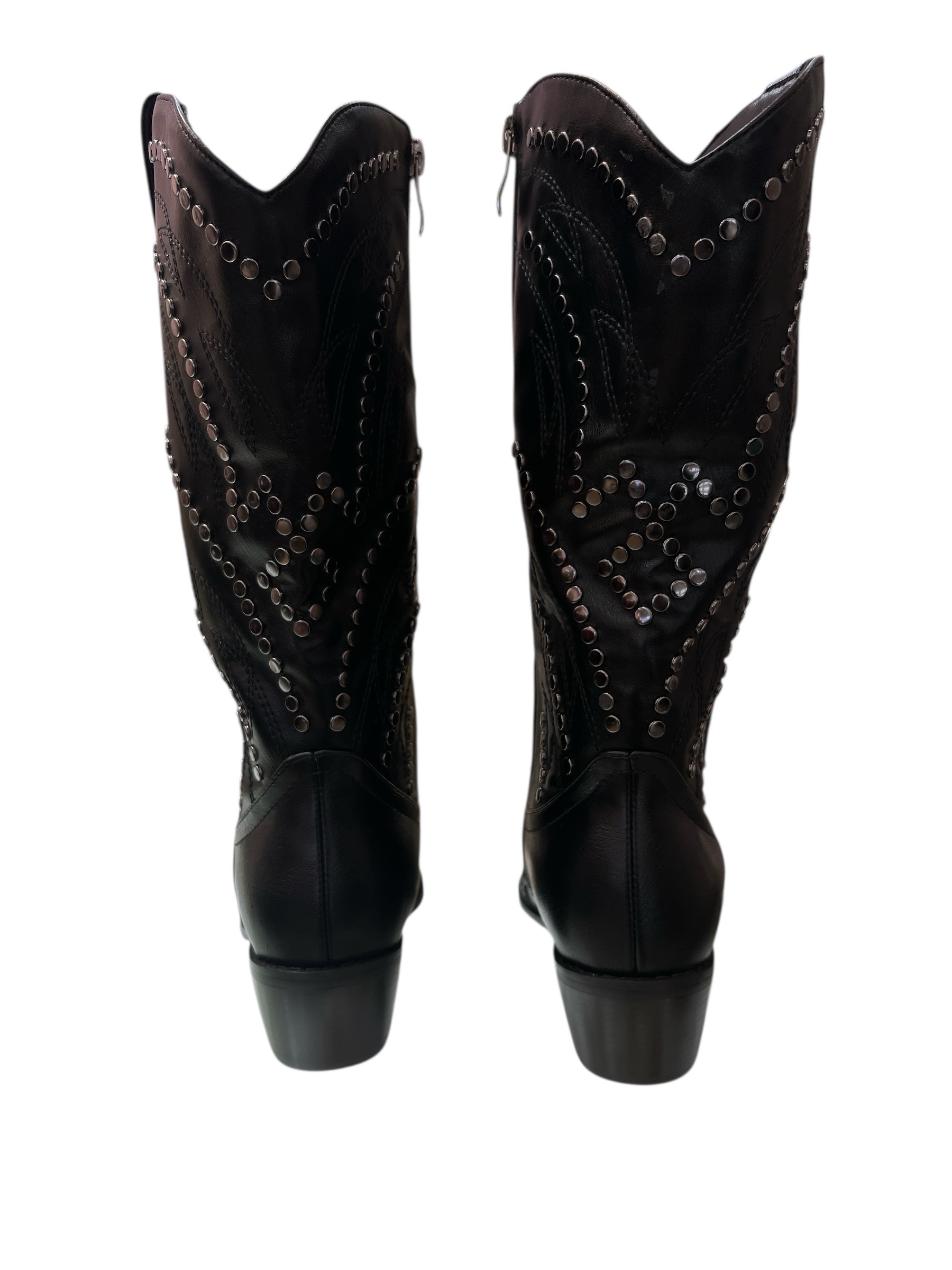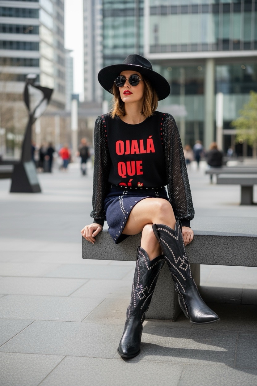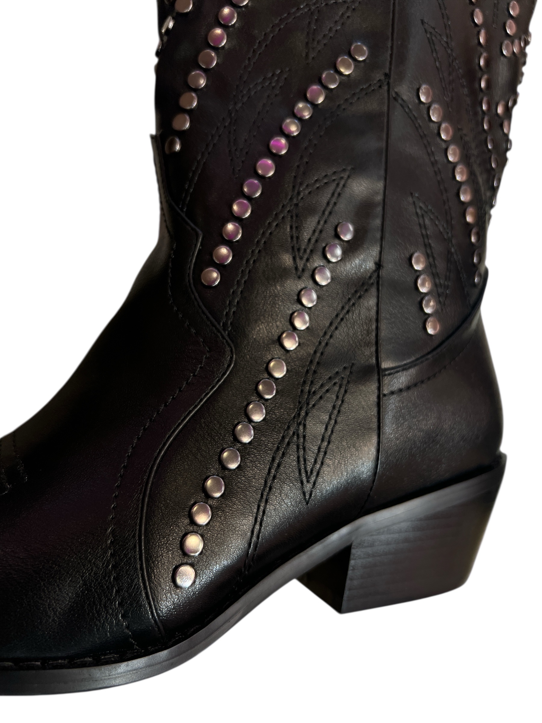 Estas botas cowboy negras con tachas para mujer son ese fondo de armario que no falla. Con un diseño atemporal y ese toque western que está tan en tendencia, elevan cualquier look sin esfuerzo. Están confeccionadas con materiales de alta calidad y cuentan con una planta de piel, lo que las hace increíblemente cómodas incluso en días largos