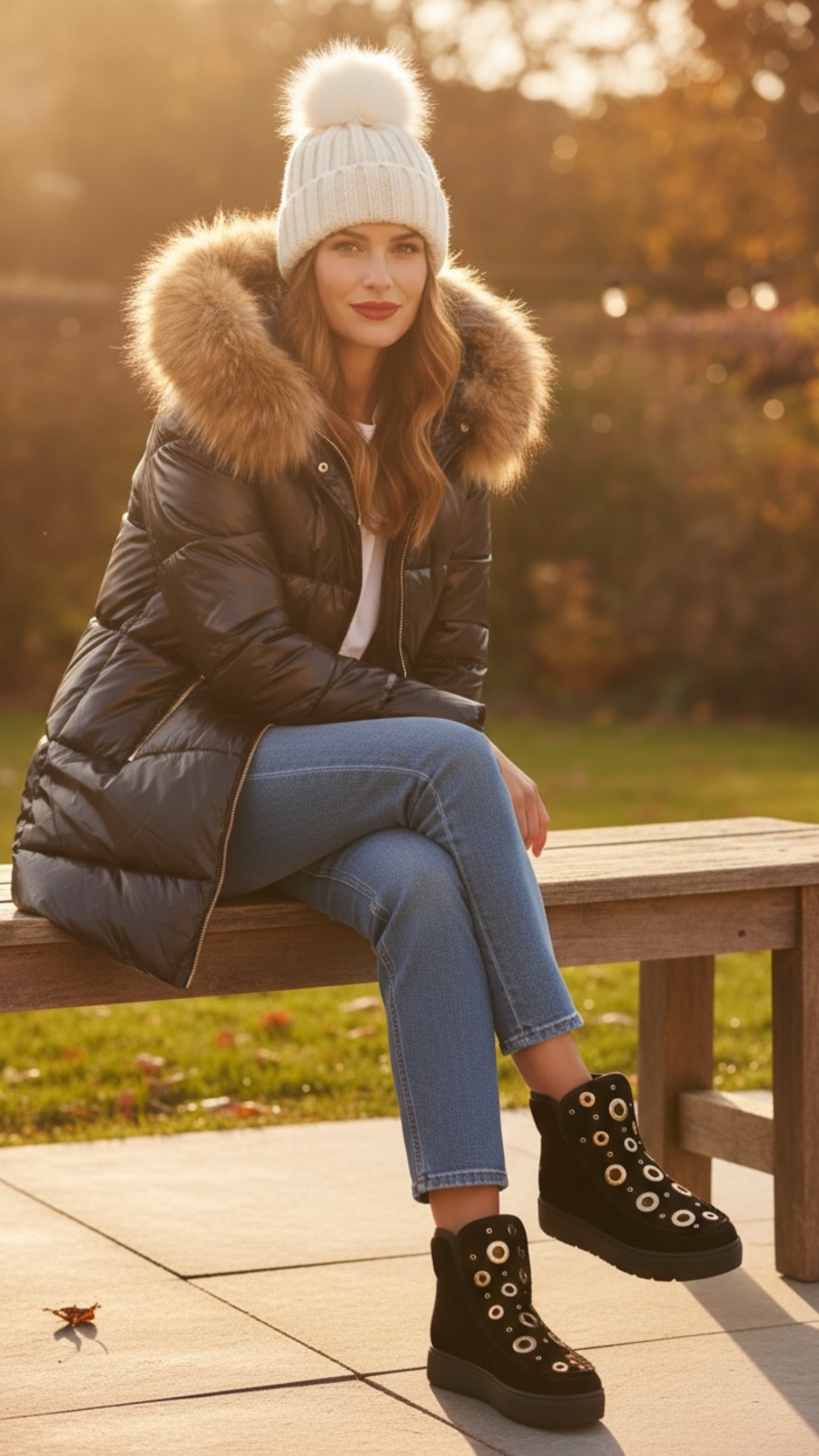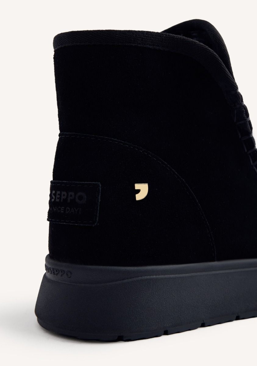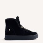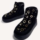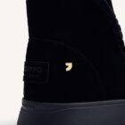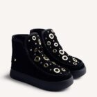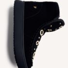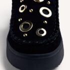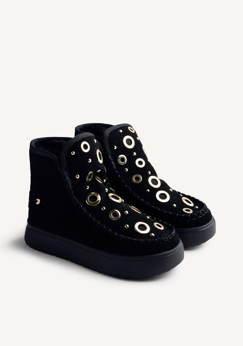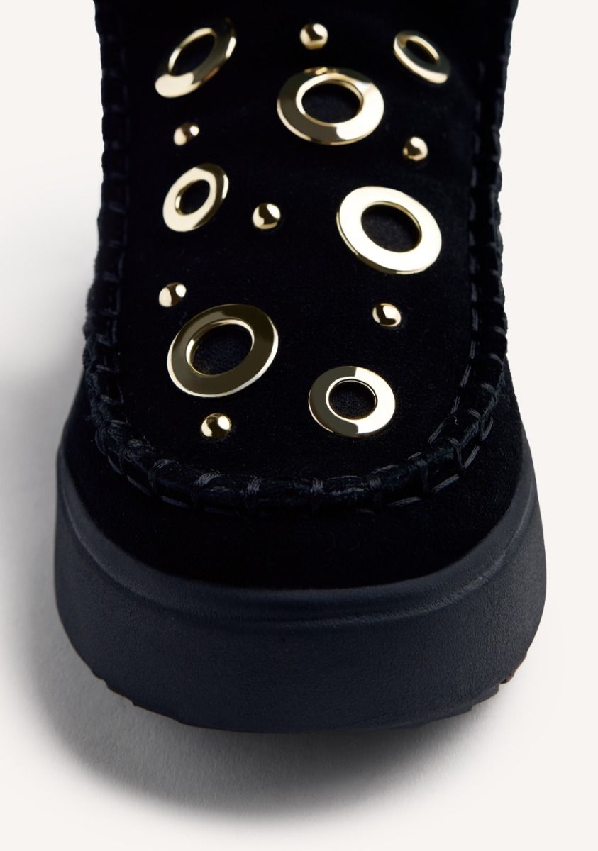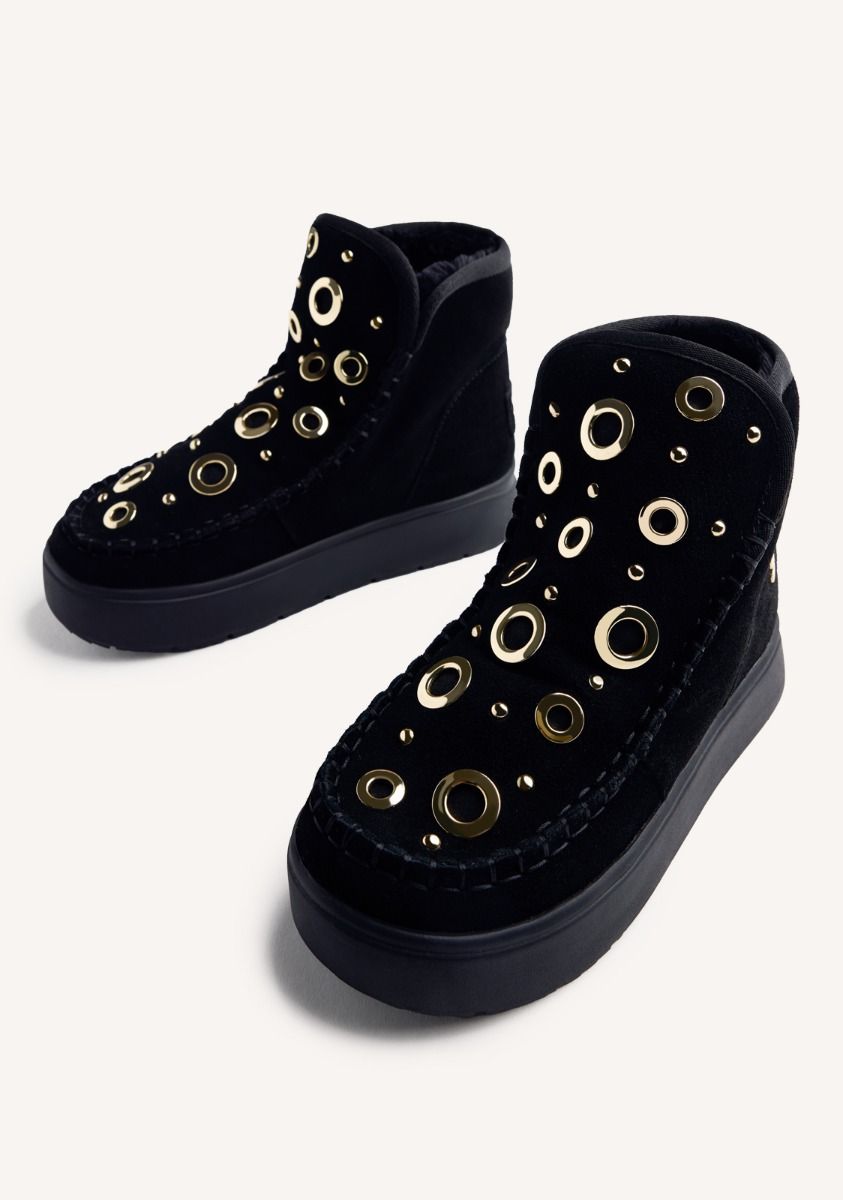 Botas de piel serraje estilo australianas con plataforma y detalle de ollados y tachas en acabado dorado. Cuentan con forro interior de pelo y plantilla acolchada de pelo. Altura plataforma: 3,5 cm. Altura caña: 12 cm. Seguimos la guía estándar de anchos de caña, ajustando la medida según la talla.