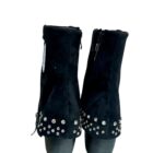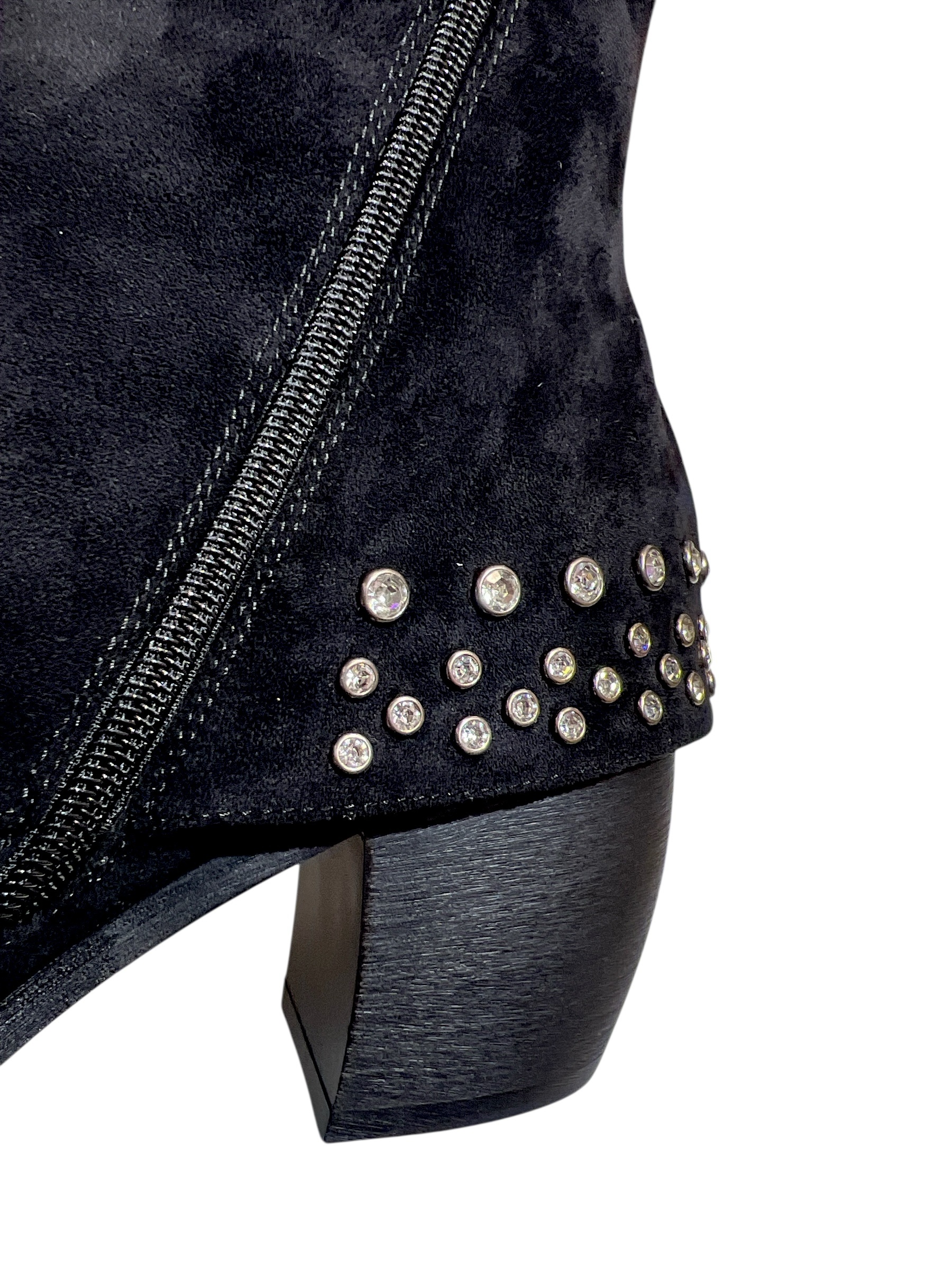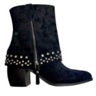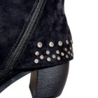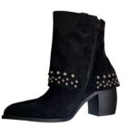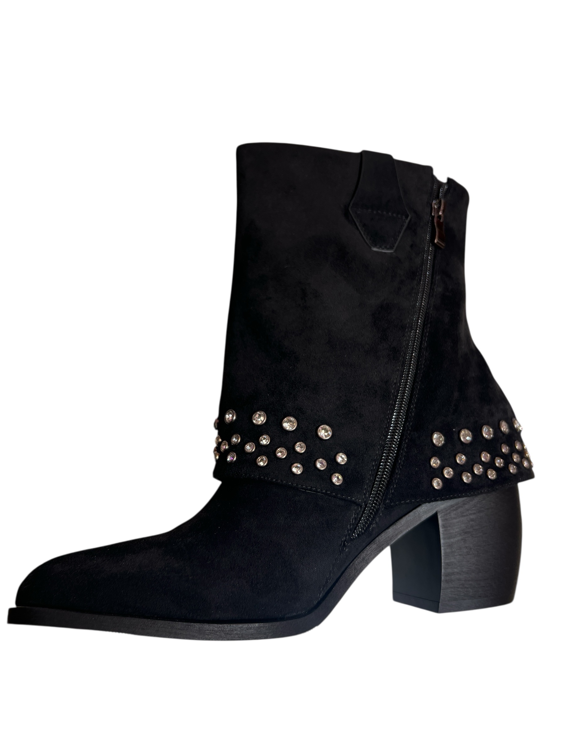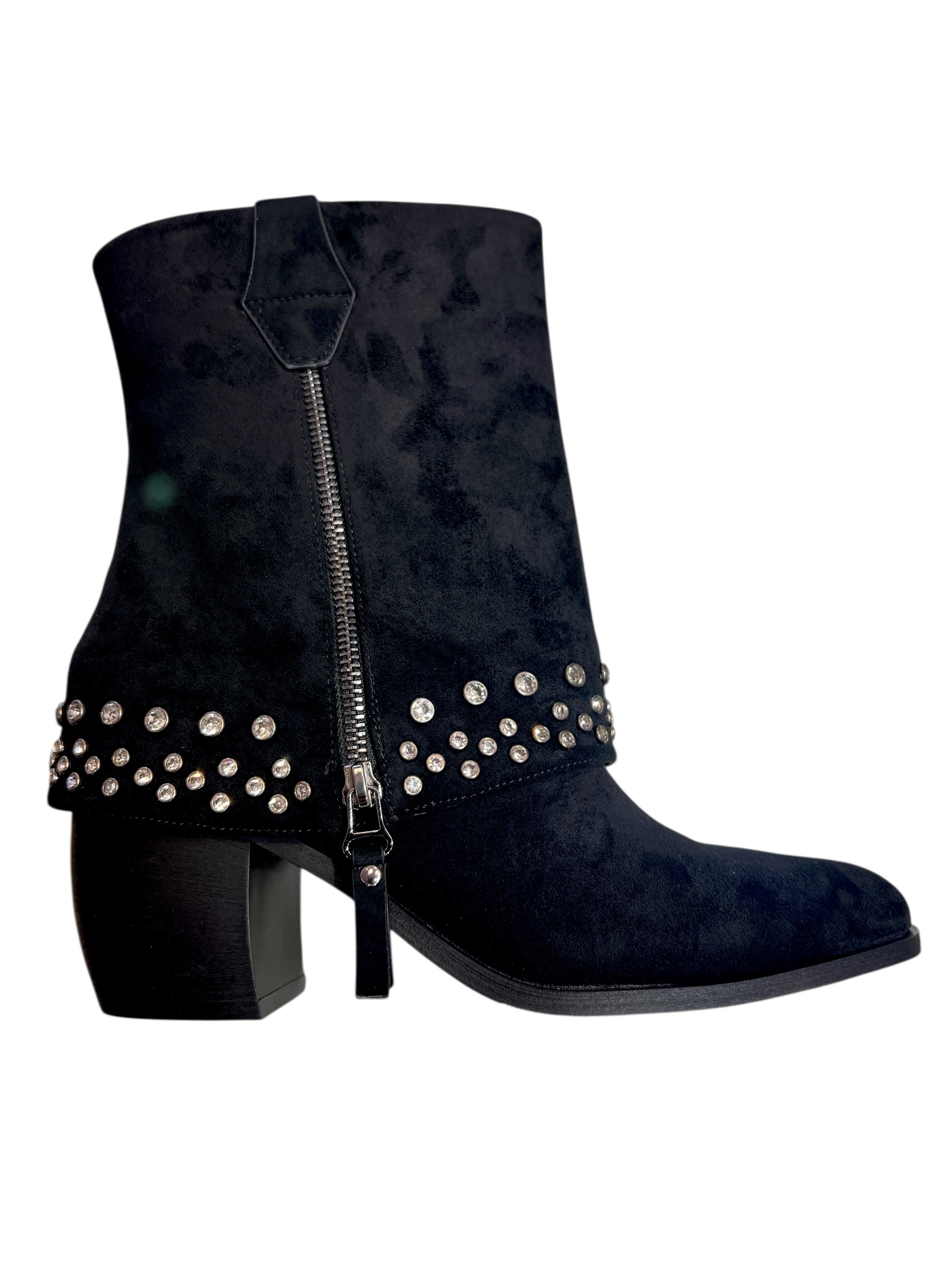 Estos botines cowboy negros con cristales fusionan estilo y comodidad de forma excepcional. Confeccionados en un material elegante de acabado liso, presentan una original vuelta superior adornada con cristales que le aportan un aire moderno y atrevido, reinventando el estilo western con carácter contemporáneo.