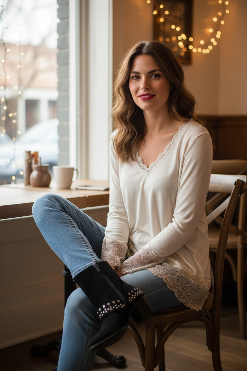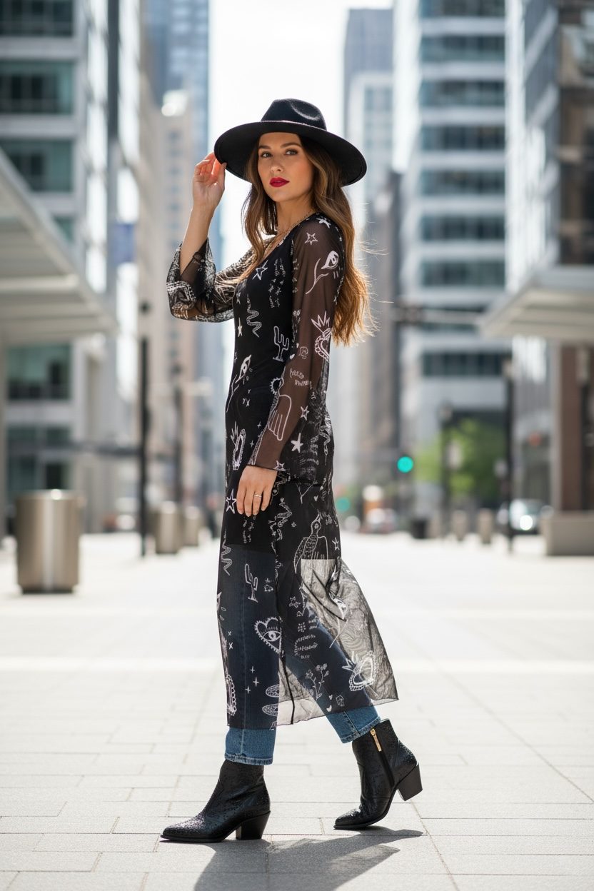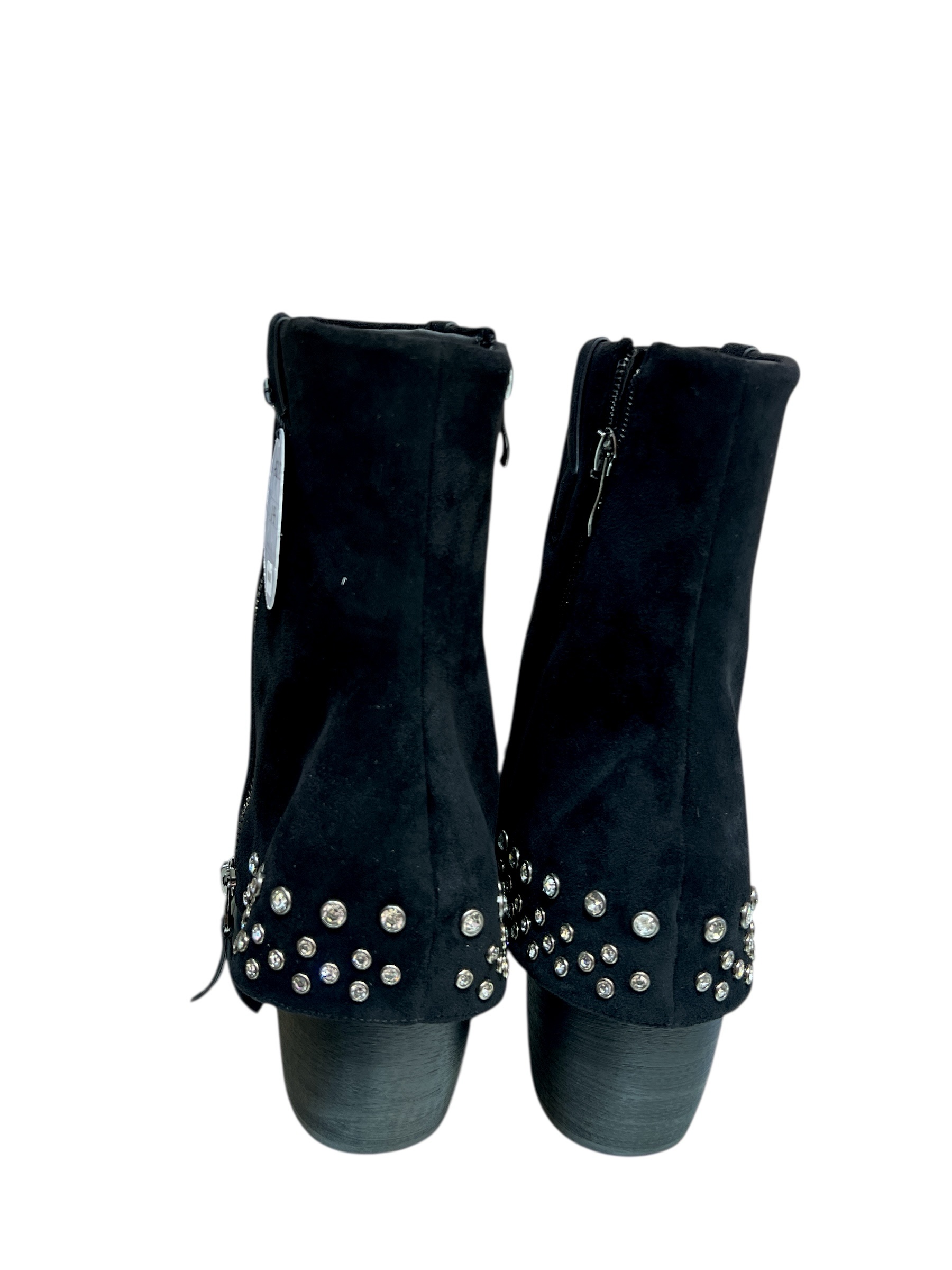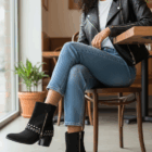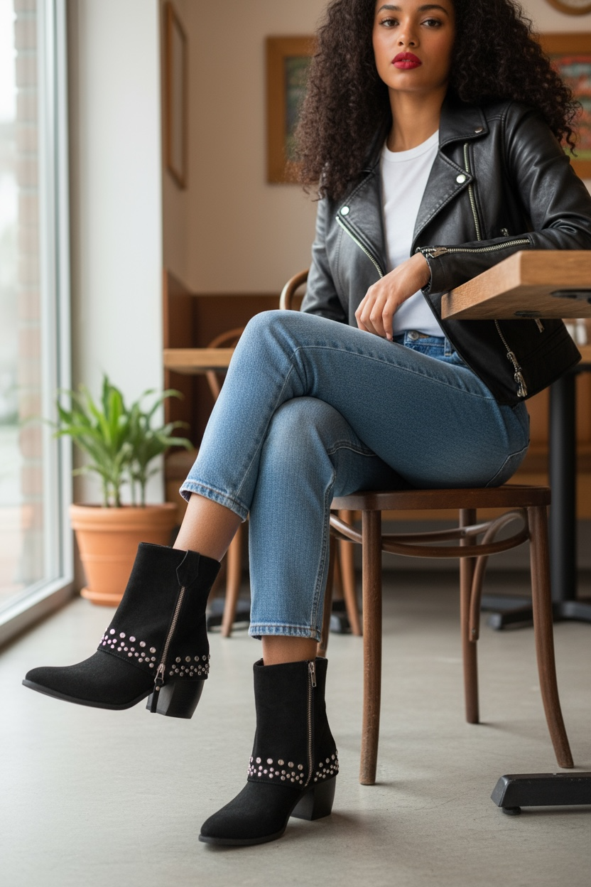 Estos botines cowboy negros con cristales fusionan estilo y comodidad de forma excepcional. Confeccionados en un material elegante de acabado liso, presentan una original vuelta superior adornada con cristales que le aportan un aire moderno y atrevido, reinventando el estilo western con carácter contemporáneo.