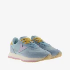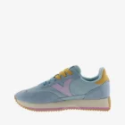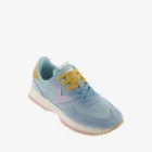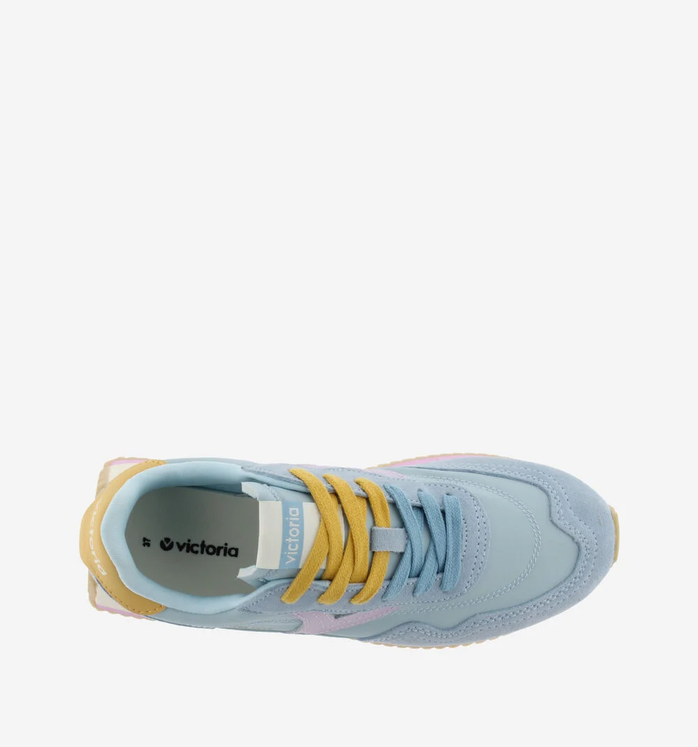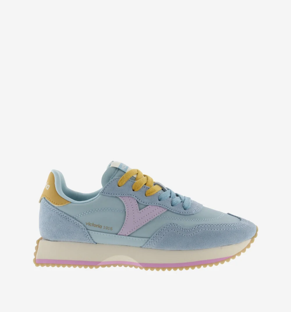 Sneakers multicolor para mujer fabricadas en nylon con piezas de serraje superpuestas al tono. V de victoria lateral y pieza trasera en colores efecto piel. Cierre mediante doble cordón: unos al tono, y otros a juego con la pieza trasera. Suela bicolor de EVA con patín dentado de goma color caramelo.