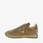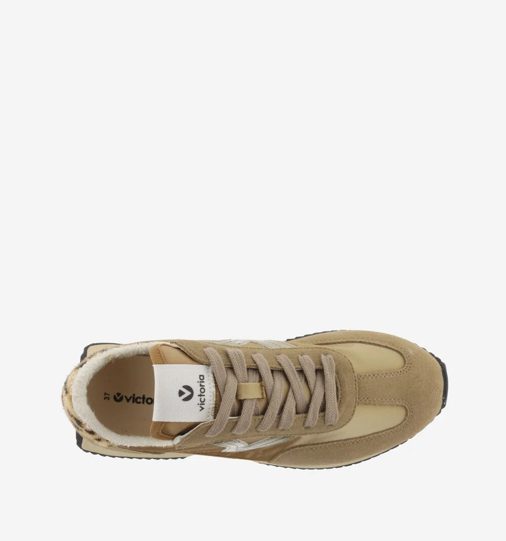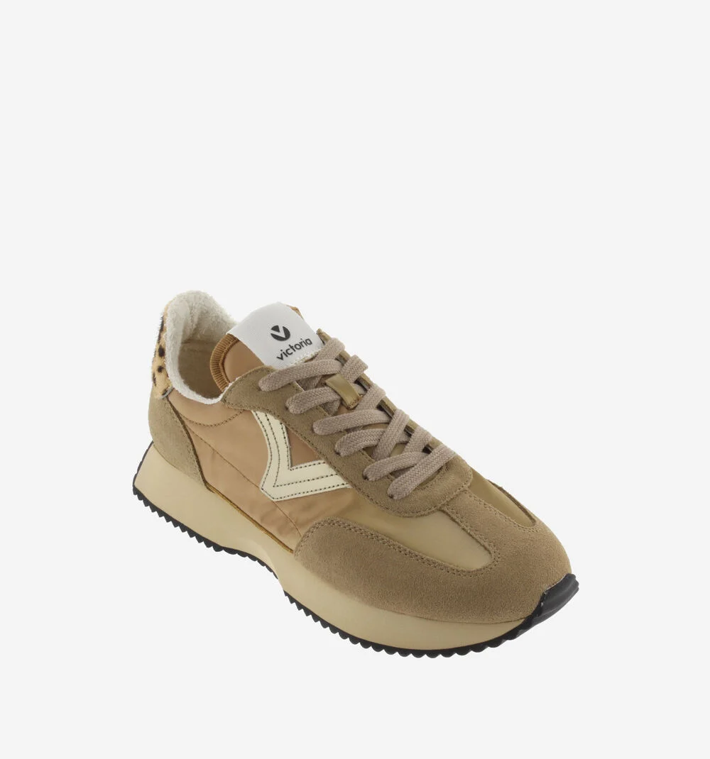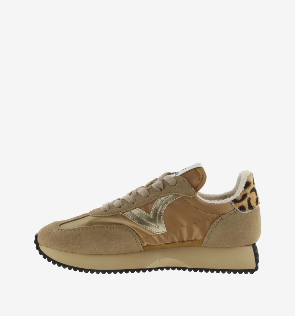 Sneakers para mujer confeccionadas en nylon con piezas de serraje y detalles metalizados y en animal print. Cierre mediante cordones al tono. Interior de rizo. La suela tostada y el patín dentado en negro añaden un toque dinámico y desenfadado. Además, incluyen plantilla extraíble para mayor comodidad y versatilidad.
