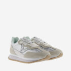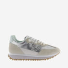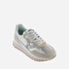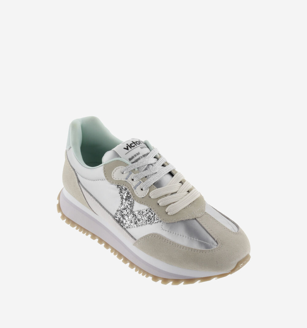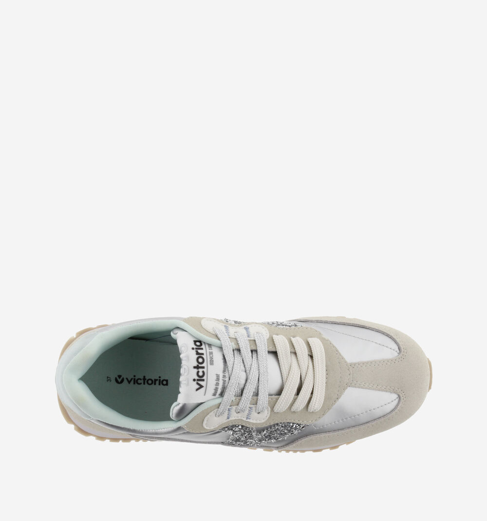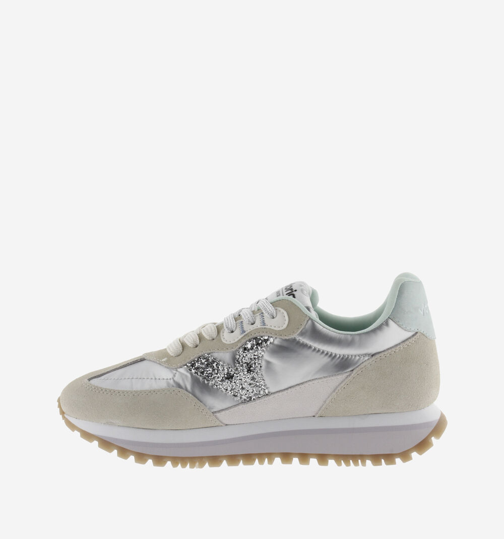 Sneakers para mujer fabricadas en nylon metalizado con piezas de serraje superpuestas al tono. V de victoria lateral en glitter y detalle de color pastel en pieza trasera a juego con el forro interior. Cómoda suela tricolor de phylon con patín de TPR en relieve color caramelo.
