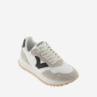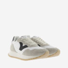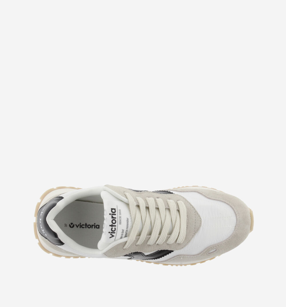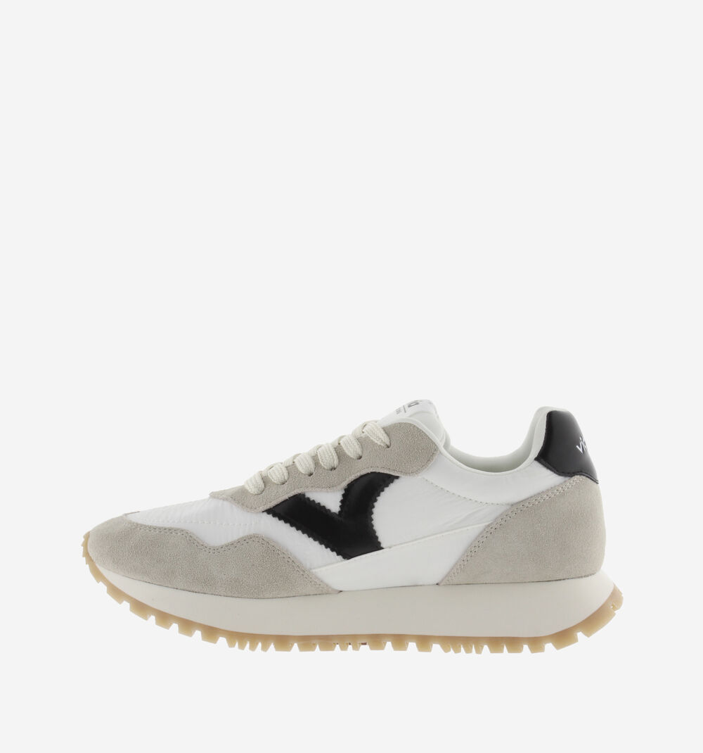 Sneakers para mujer fabricadas en nylon blanco con piezas de serraje superpuestas. V de victoria lateral y pieza trasera con el logotipo de la marca en colores efecto piel a juego en contraste. Cómoda suela de phylon con patín de TPR en relieve color caramelo.