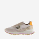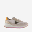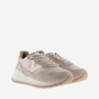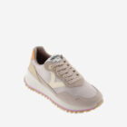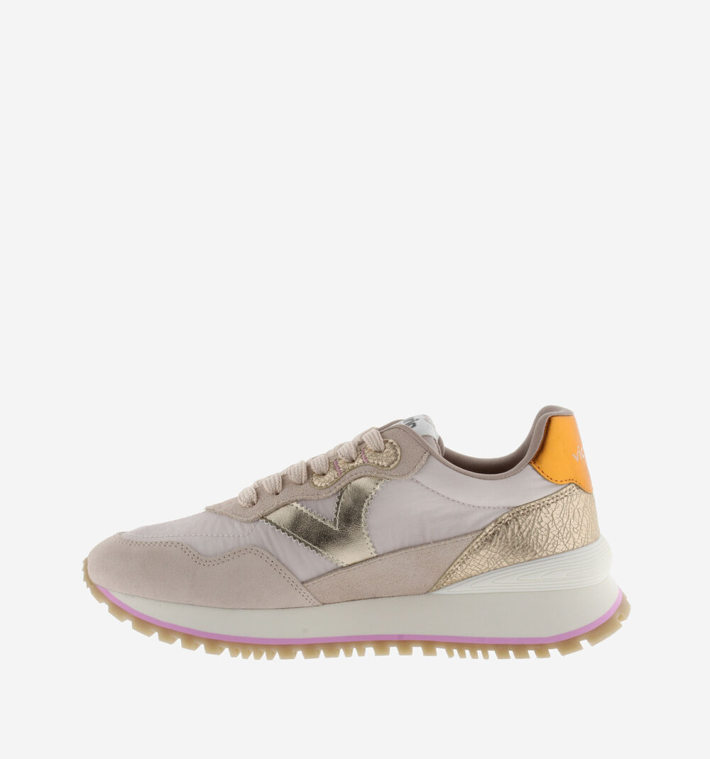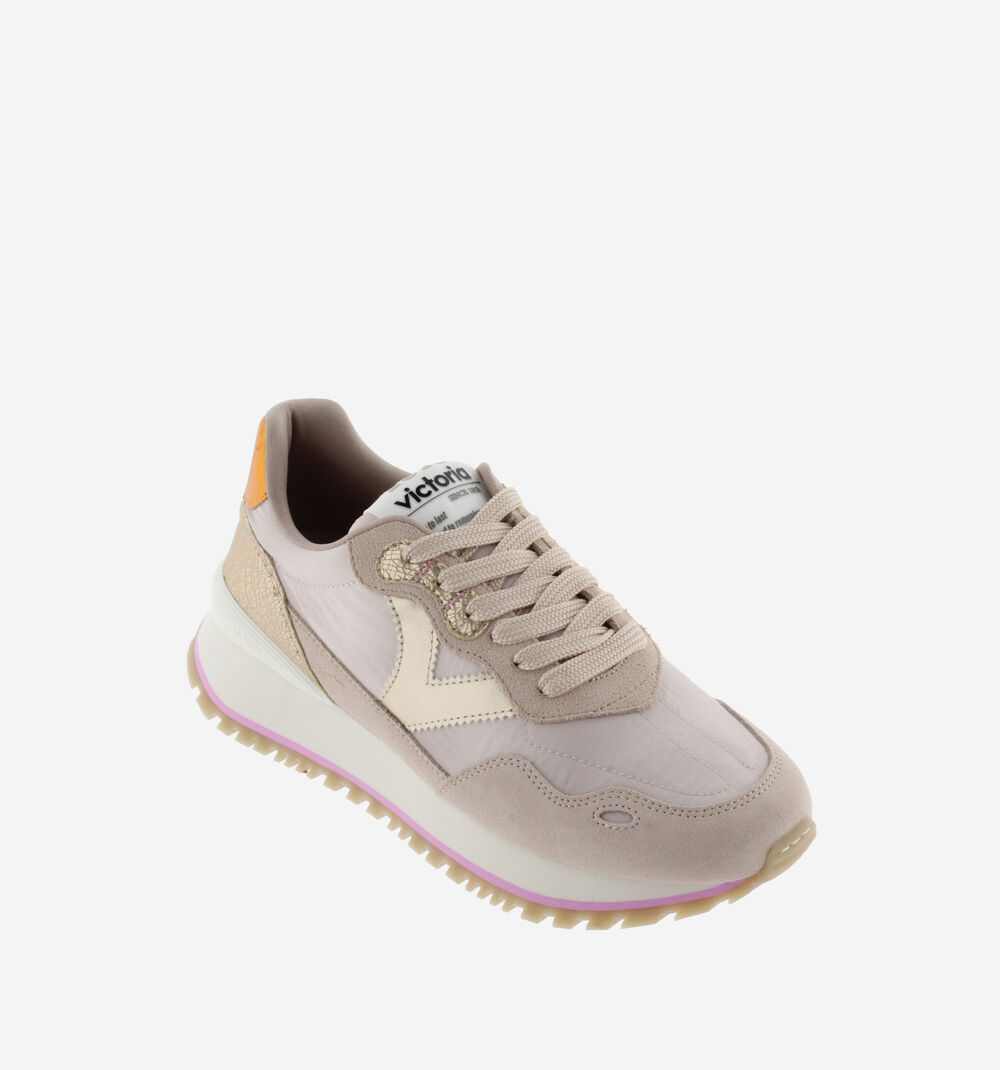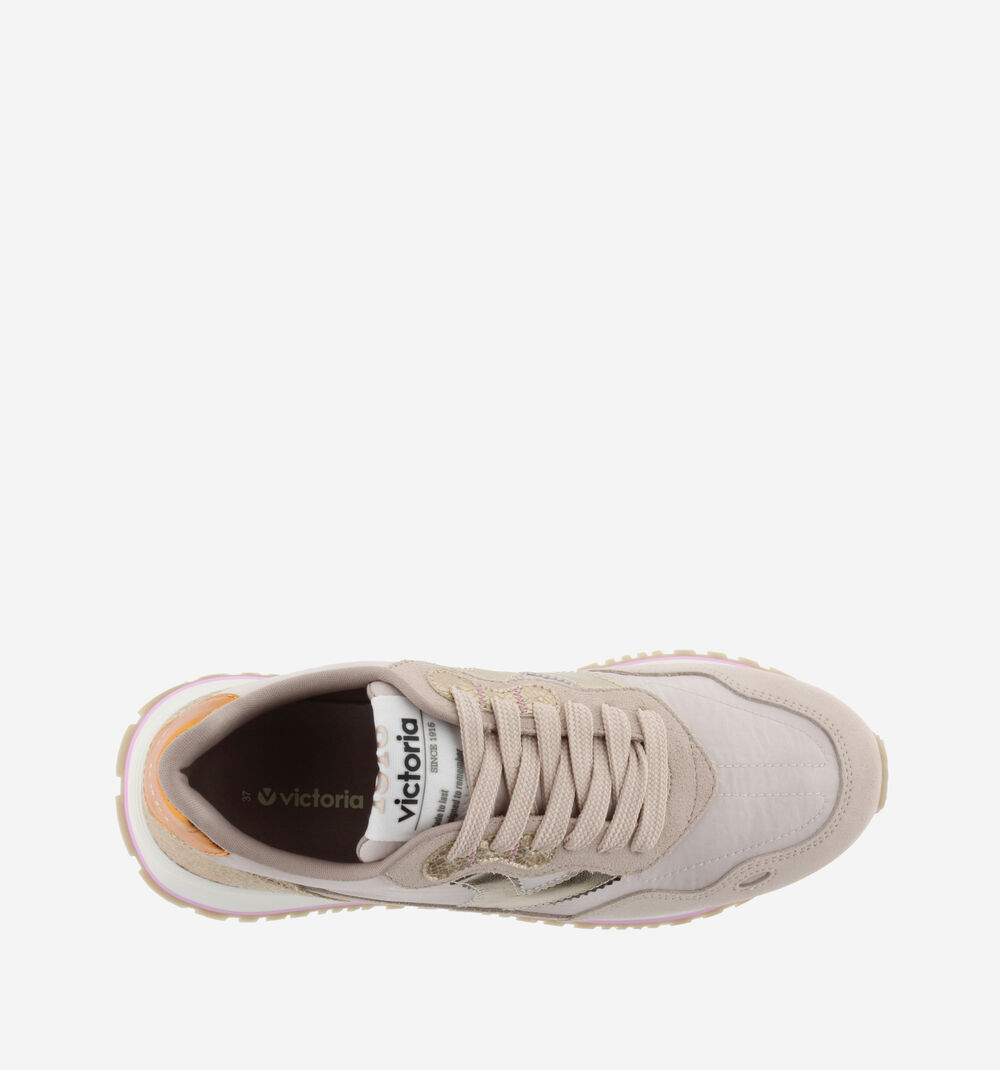 Sneakers para mujer fabricadas en nylon con piezas de serraje superpuestas al tono. V de victoria lateral y piezas traseras en tonos metalizados. Cierre mediante cordones al tono con cabetes de color. Cómoda suela bicolor de phylon con patín de TPR en relieve color caramelo, y estabilizador en el talón.