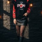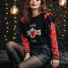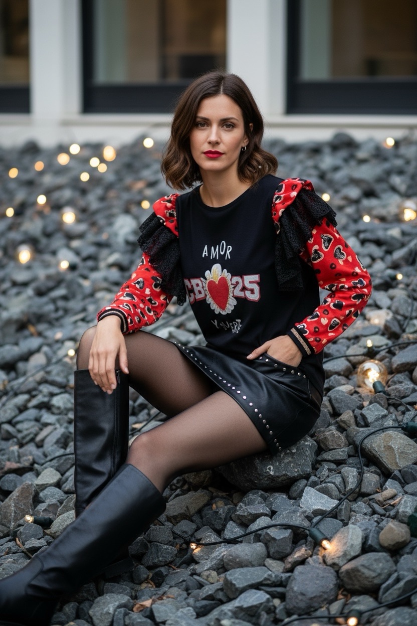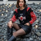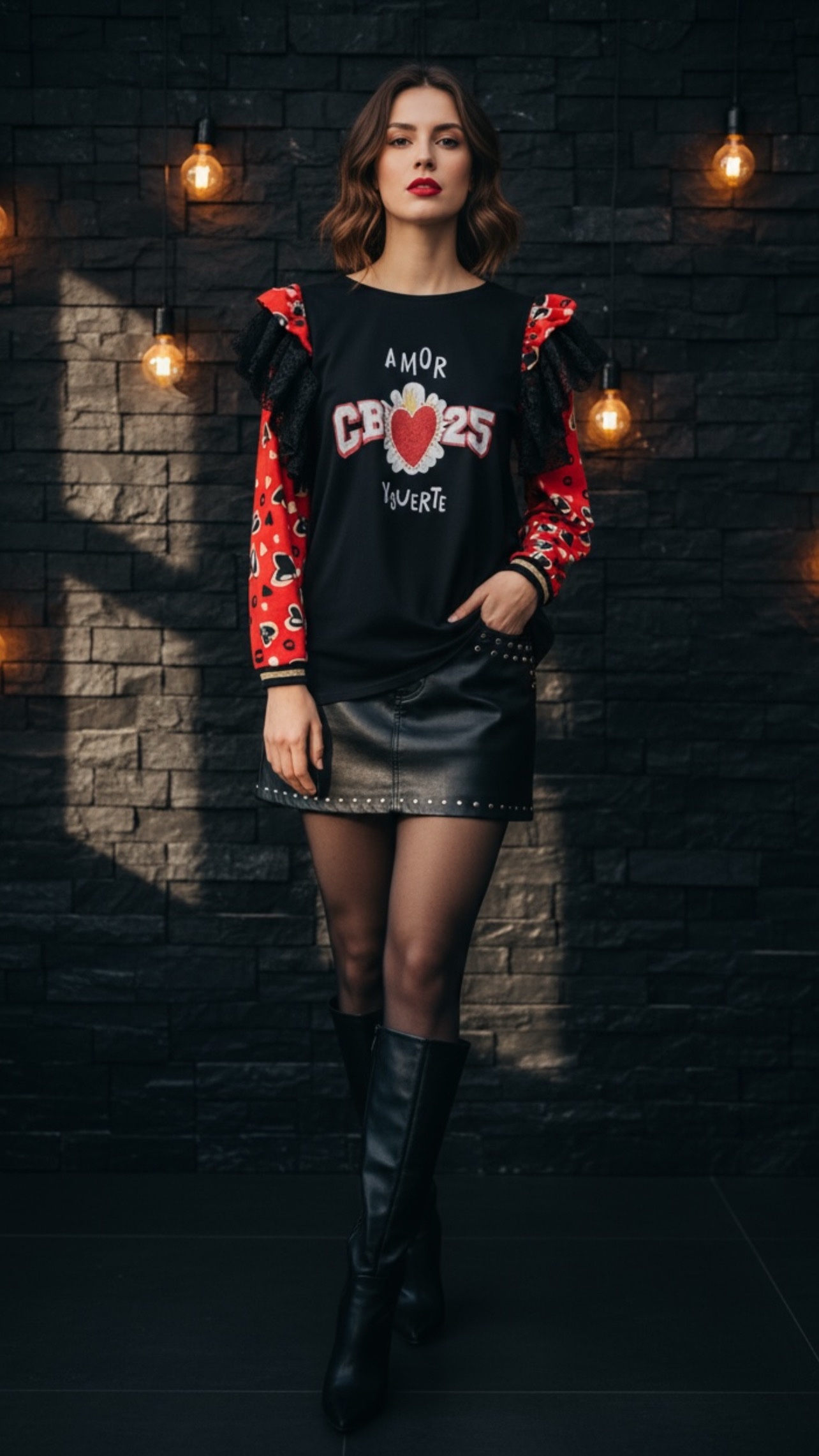 Camiseta de algodón en color negro, con cuello redondo, corte evasé y bajo asimétrico. Manga larga con estampado corazones.
