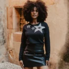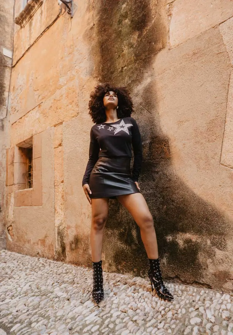 Camiseta con estrellas glitter de diferentes tamaños rodeando el cuello. Las estrellas tienen la capacidad de adaptarse a tu narrativa: pueden ser etéreas, fuertes, rebeldes, pero también nostálgicas y soñadoras. Se transforma según tu visión. Diseño propio y fabricación en Portugal, cuidando hasta el más mínimo detalle. Todas nuestras prendas llevan un marcapáginas con un texto inspirador. La modelo lleva una talla S y sus medidas son: altura 167, pecho 90, cintura 60 y cadera 90 cm.