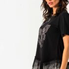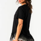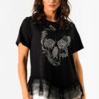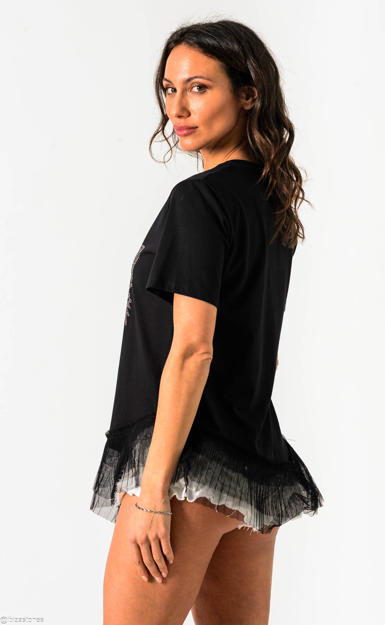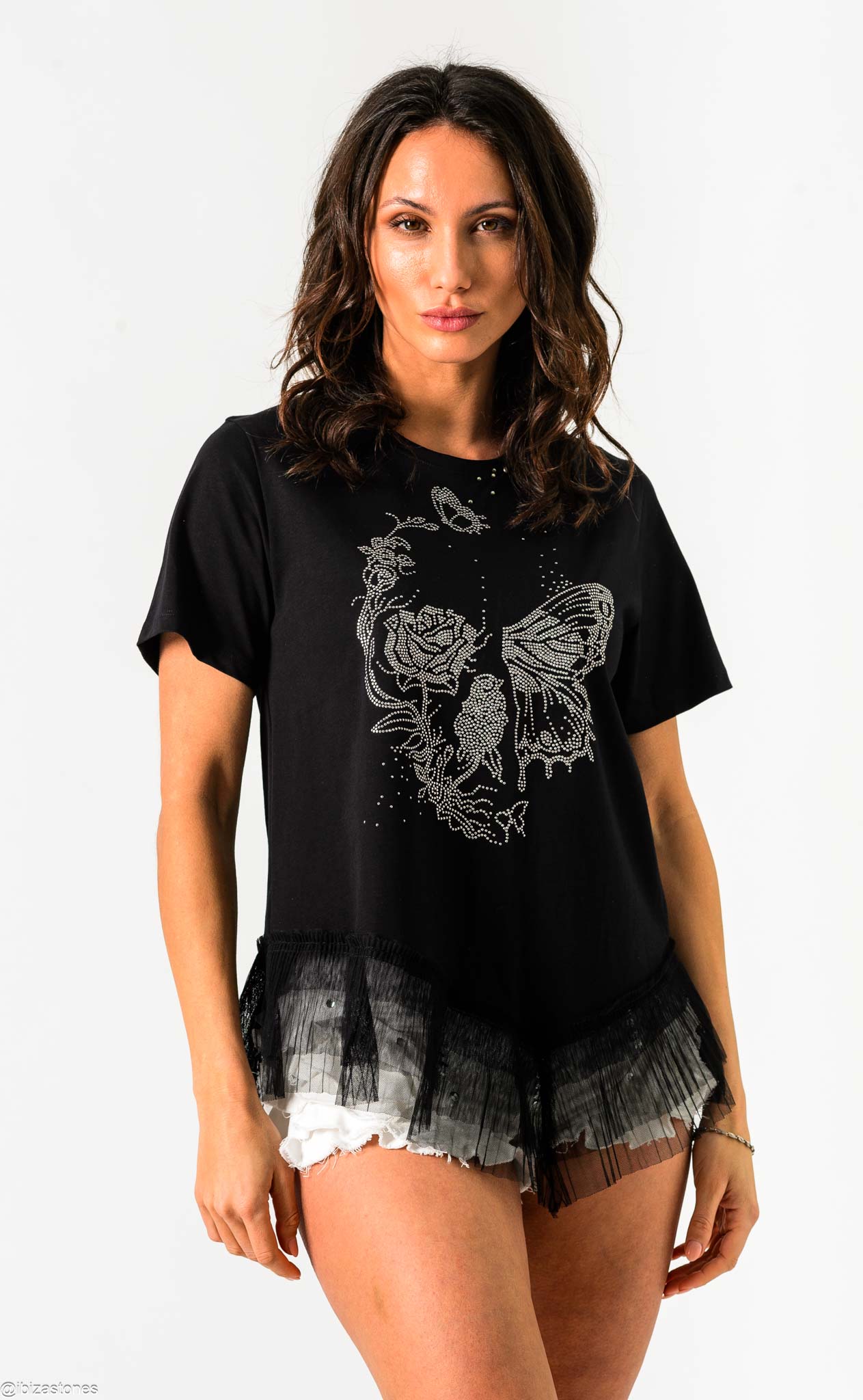 Camiseta de manga corta con bajo asimétrico y aplique de tul plisado, combinada con un gráfico de pedrería en el frontal. Un toque de actitud y estilo para destacar cada día.
