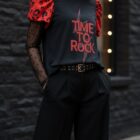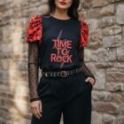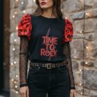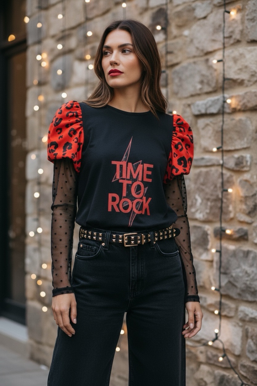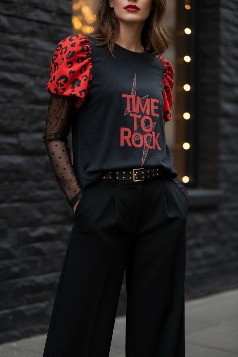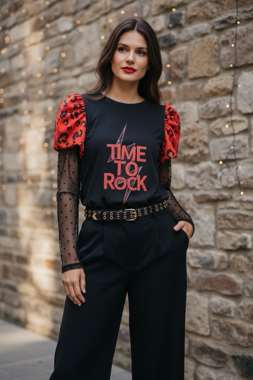 Camiseta algodón negro con cuello redondo y corte evasé. El bajo es asimétrico. Manga corta abullonada con estampado de leopardo en rojo.
