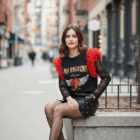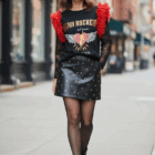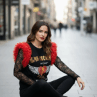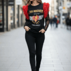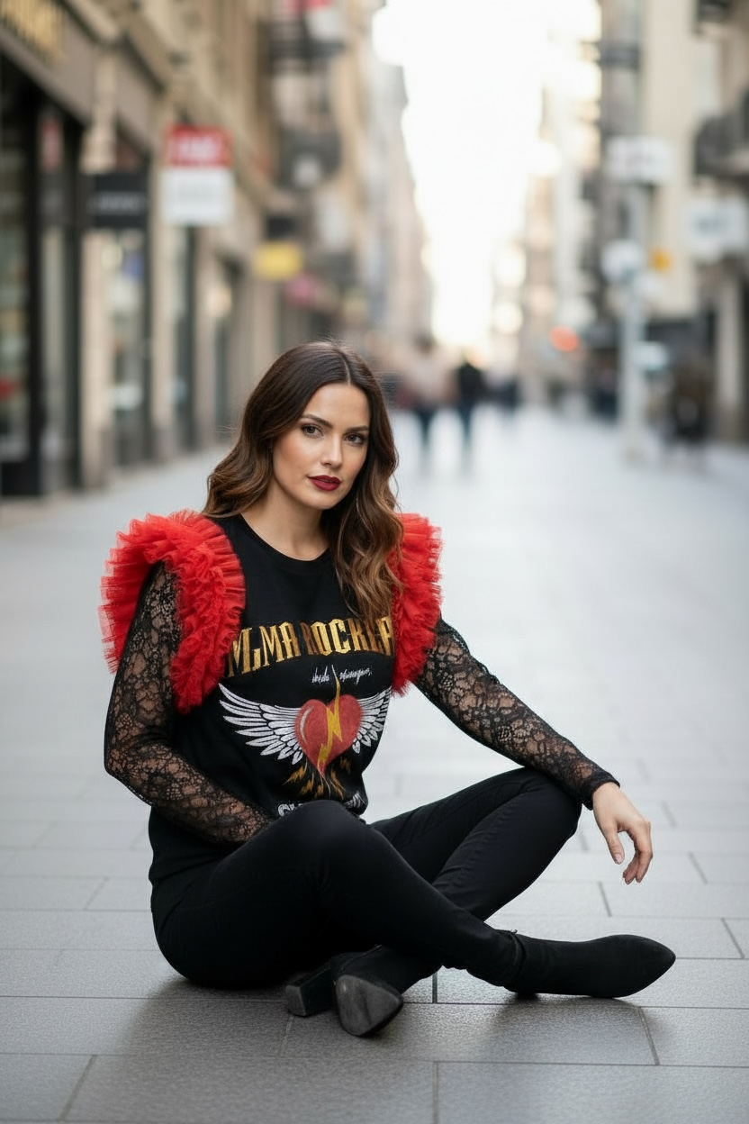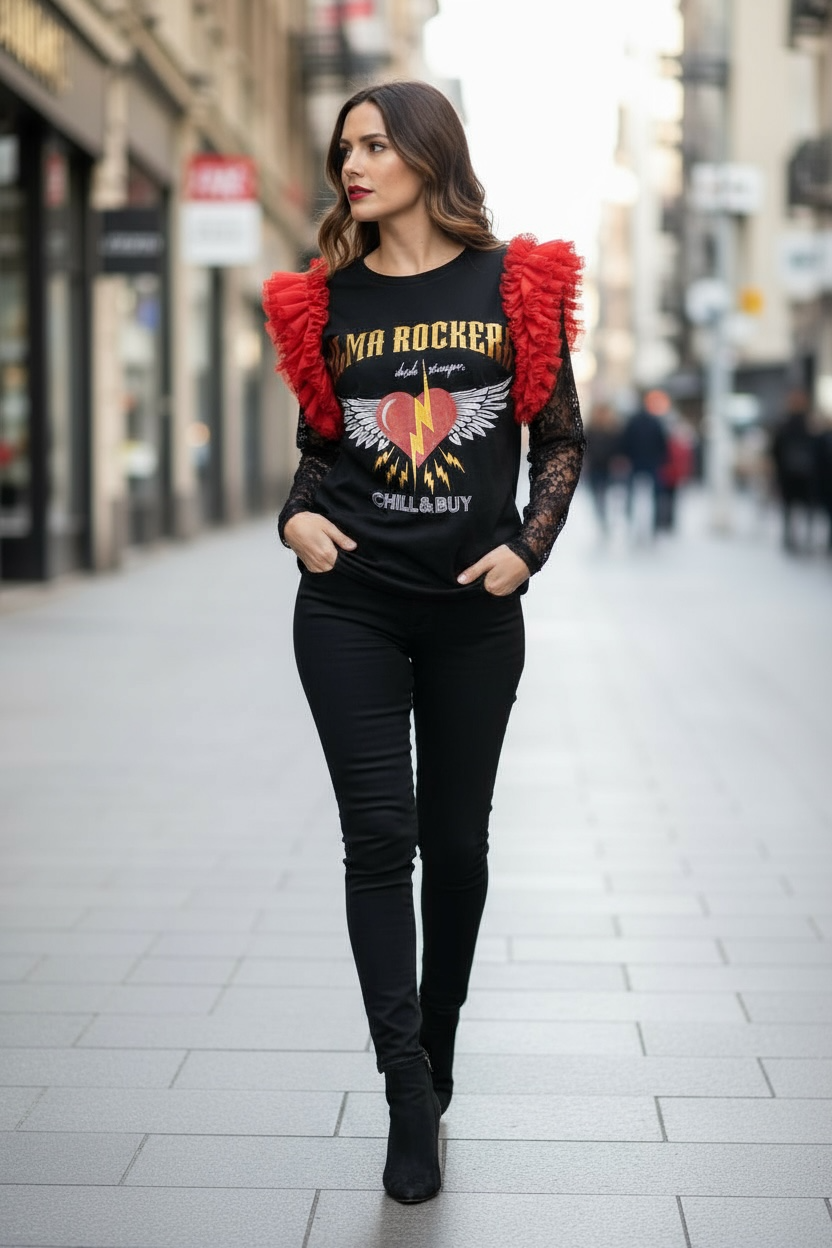 Camiseta de algodón color negro , cuello redondo, corte evasé y bajo asimétrico. Detalle de tul en tono rojo en las mangas.