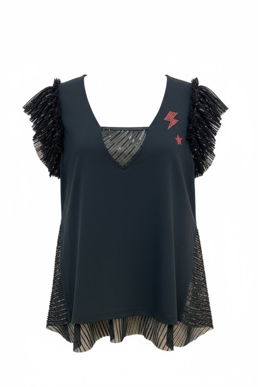 Características: Top con apliques de tejido de lentejuelas, en las mangas y en el bajo de la espalda, creando una imagen sensual y elegante con un toque de luz.