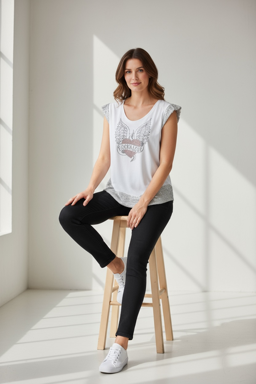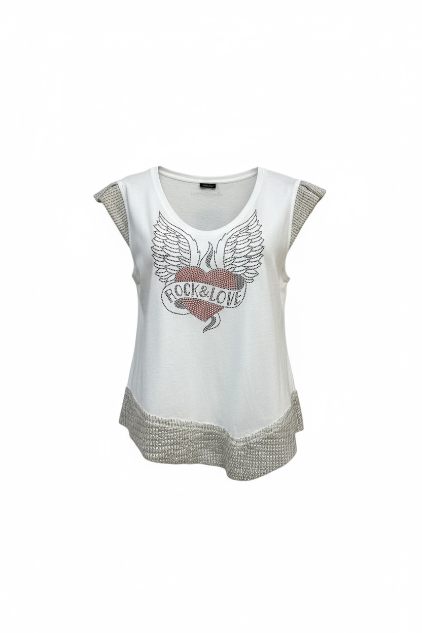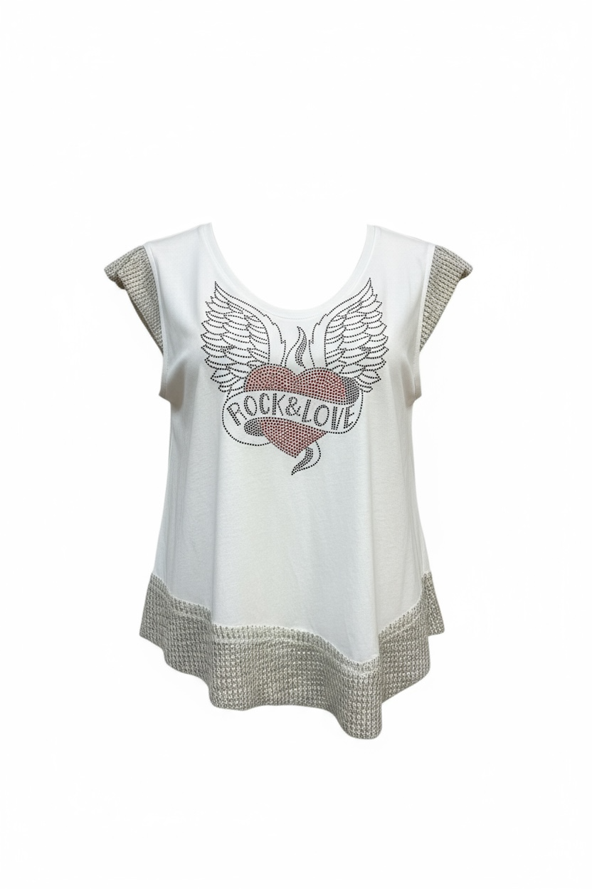 Top de bajo asimétrico y mangas con red en blanco plateado. Escote en redondo y aplicacion en el centro con strass.