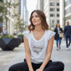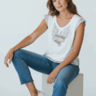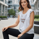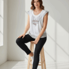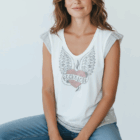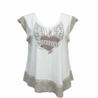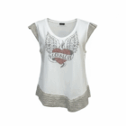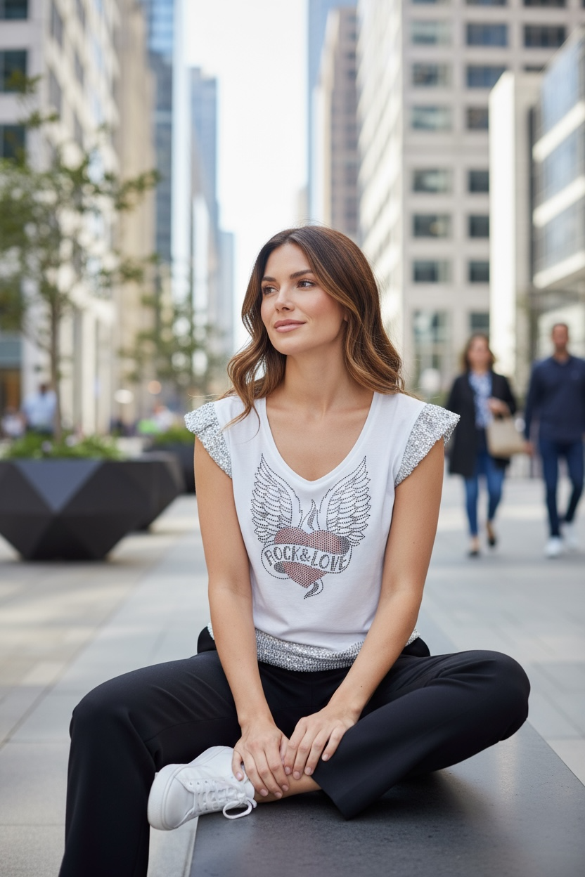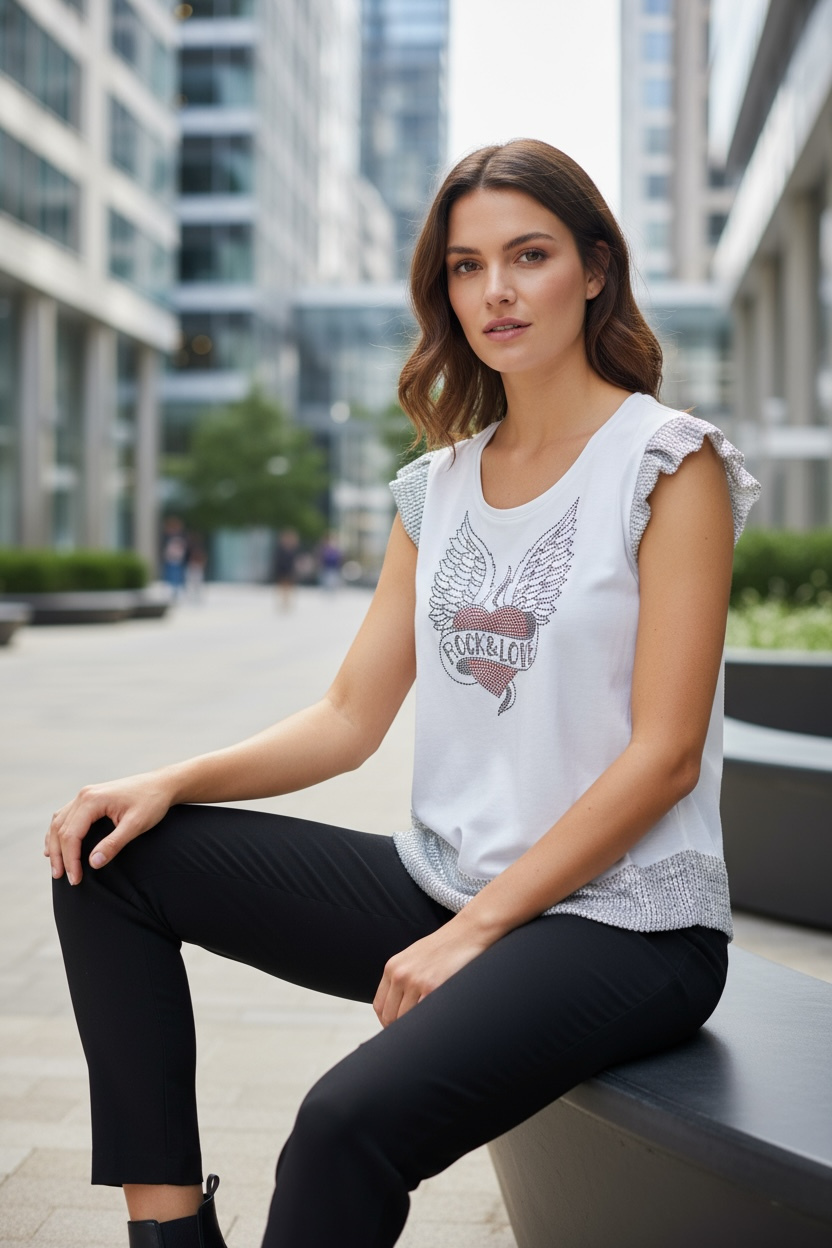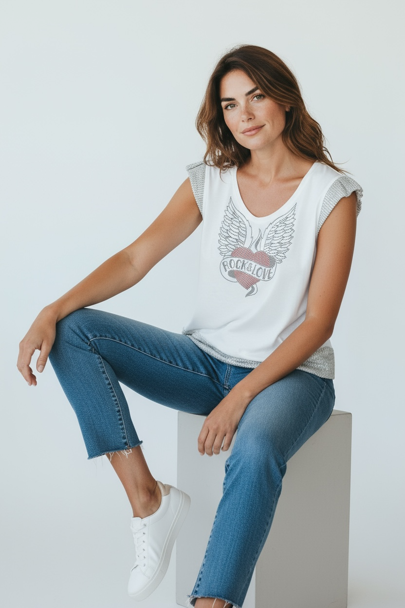 Top de bajo asimétrico y mangas con red en blanco plateado. Escote en redondo y aplicacion en el centro con strass.