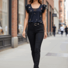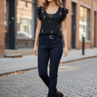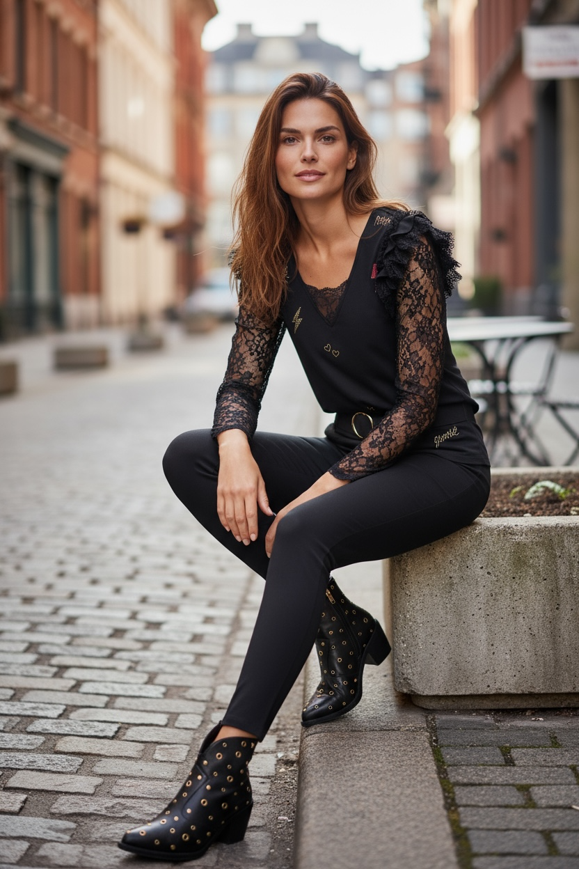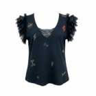 Camiseta de corte recto con pequeñas aplicaciones en rojo y dorado. Los volantes del hombro con varios tejidos en negro y encaje. El cuello en pico cerrado con un fino encaje.