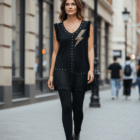 Top asimétrico con bajo y mangas con tul plisado. Cuello redondo y aplicacion de rayo con tachuelas en dorado.