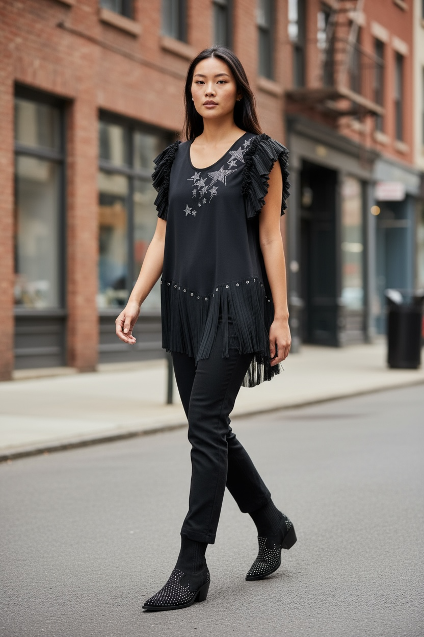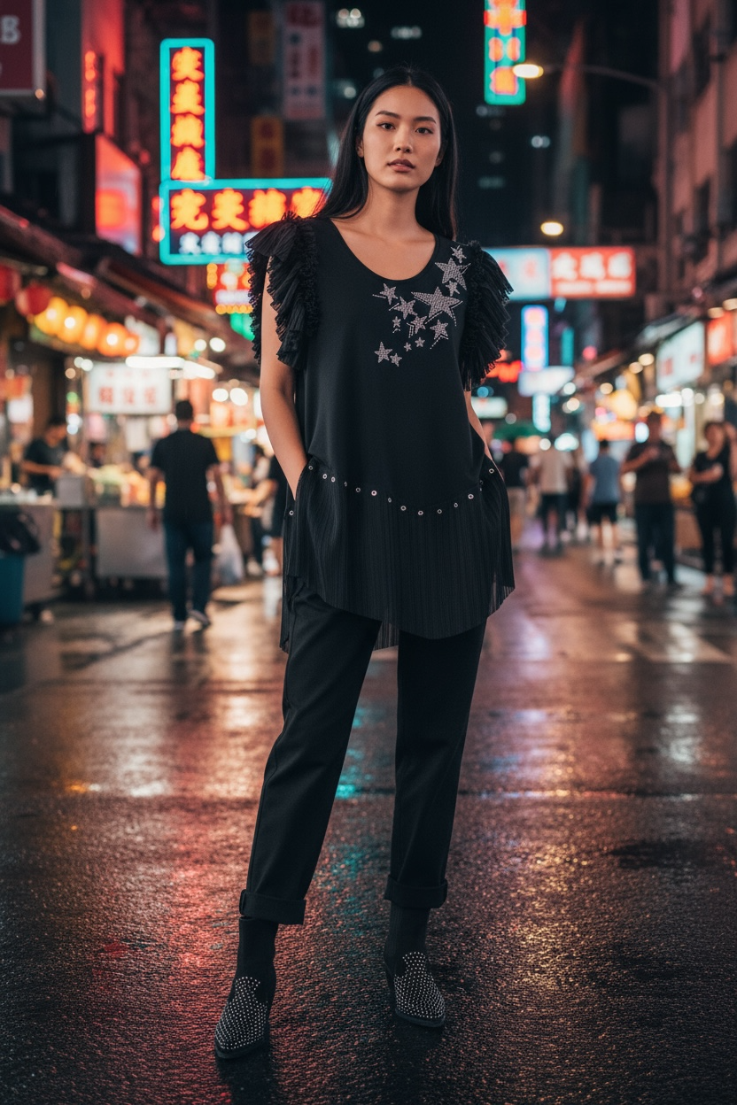 Top asimétrico con bajo y mangas con tul plisado. Cuello redondo y aplicacion de estrellas con strass en plateado.