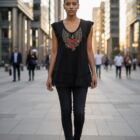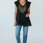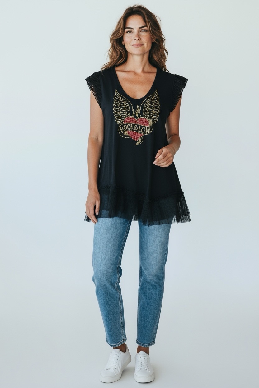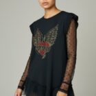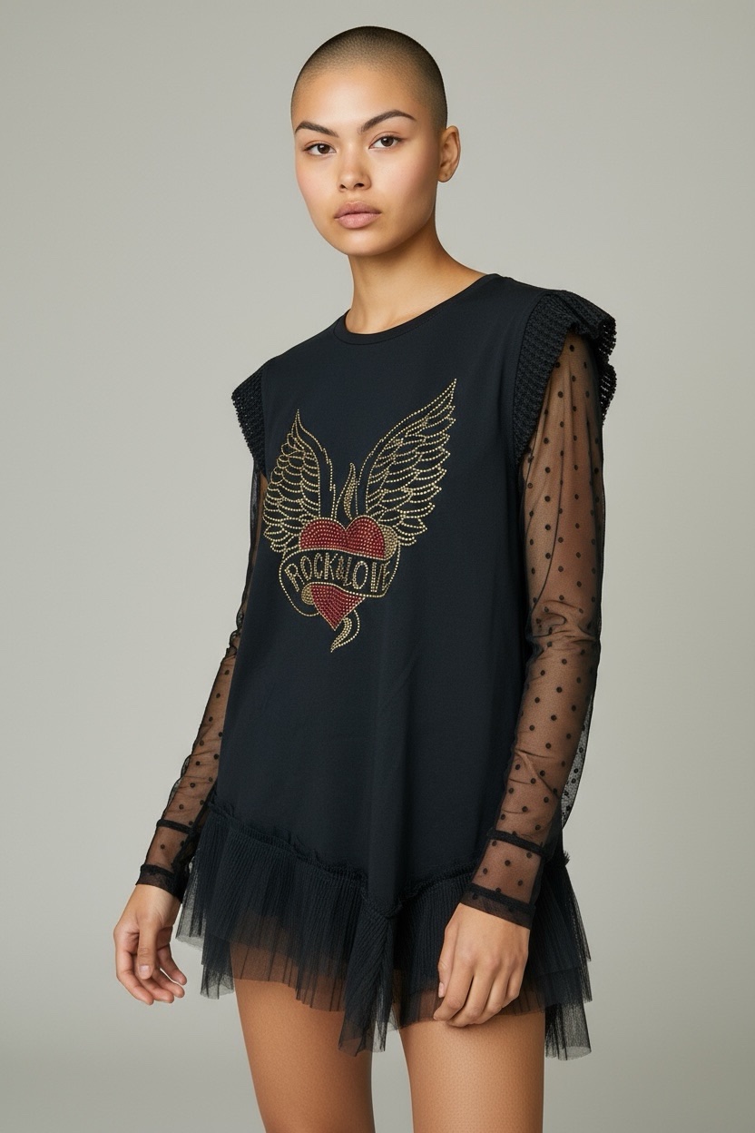 Top asimétrico con bajo y mangas con red. Cuello redondo y aplicacion con strass en dorado y rojo.
