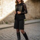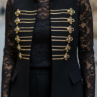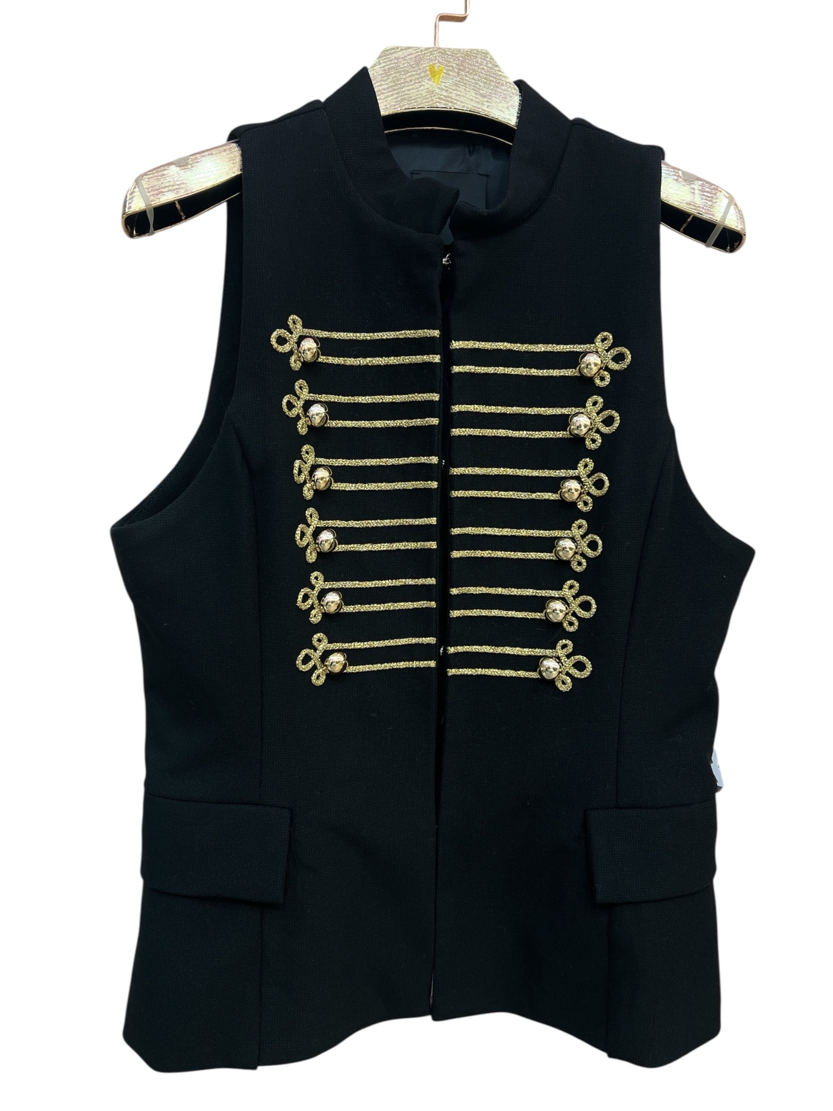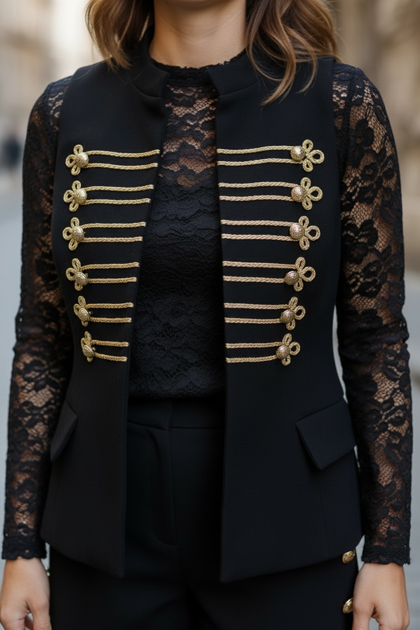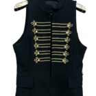 Chaleco militar negro con aplicaciones y botones en color oro.