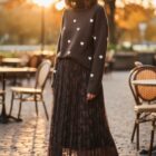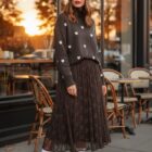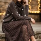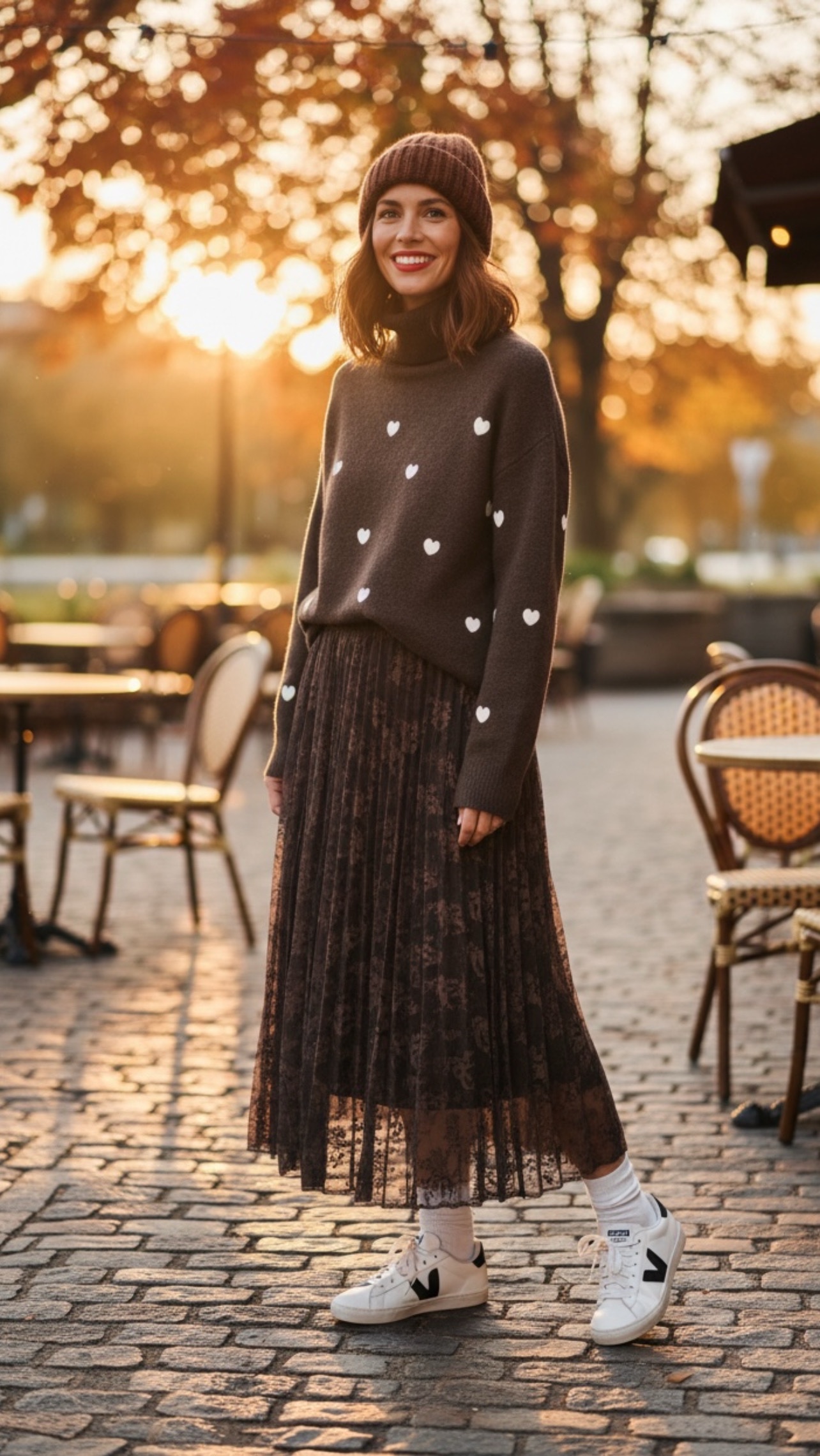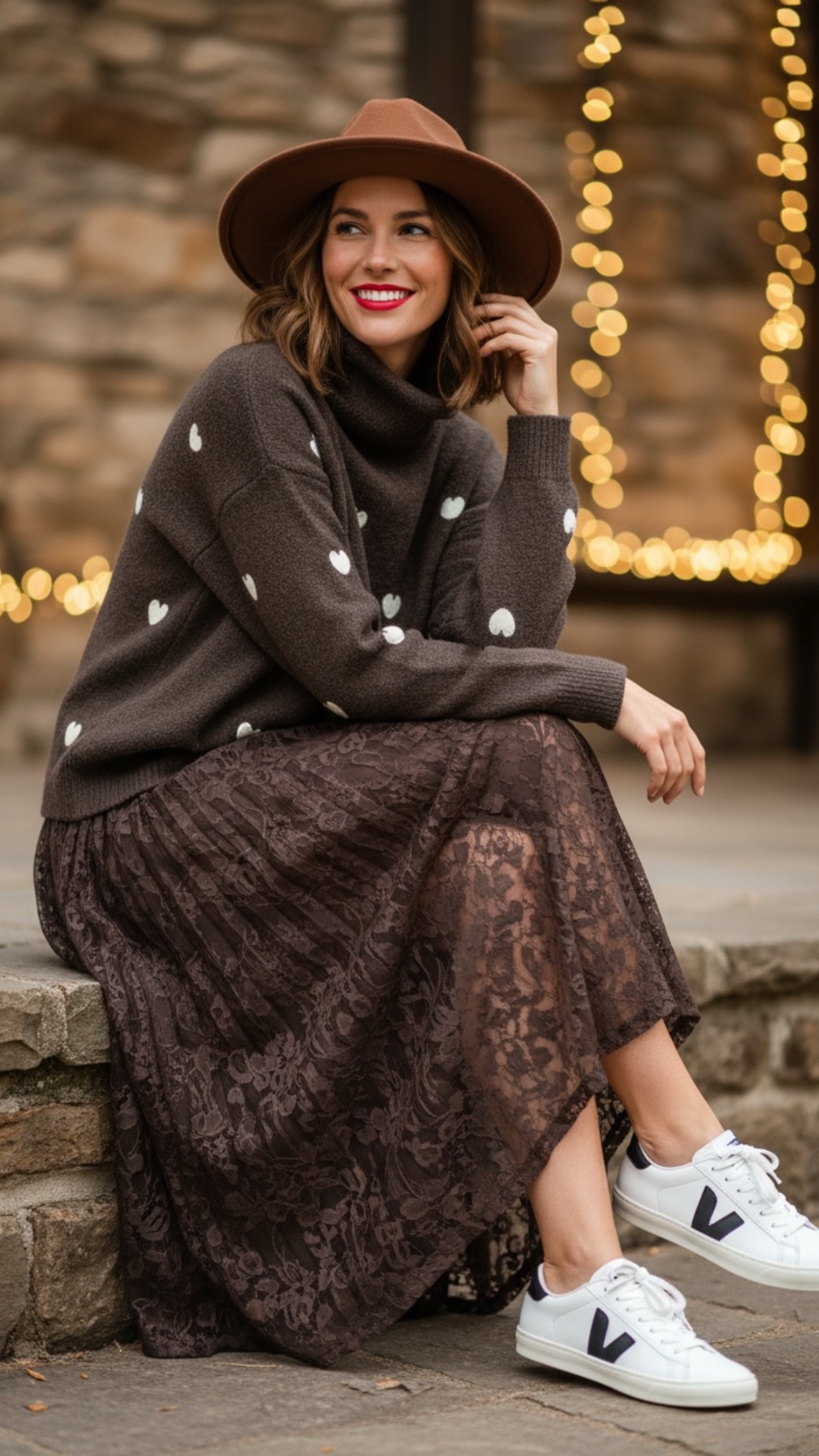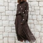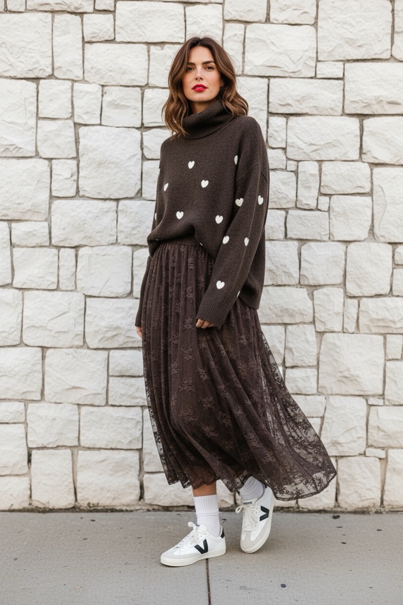 Jersey de punto marrón con corazones en blanco y cuello alto.