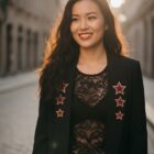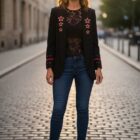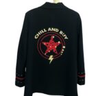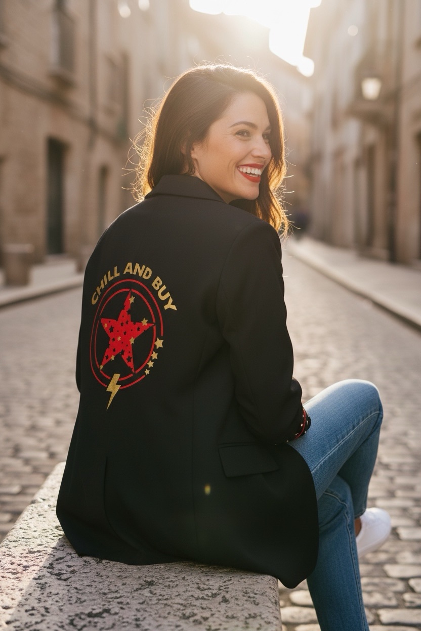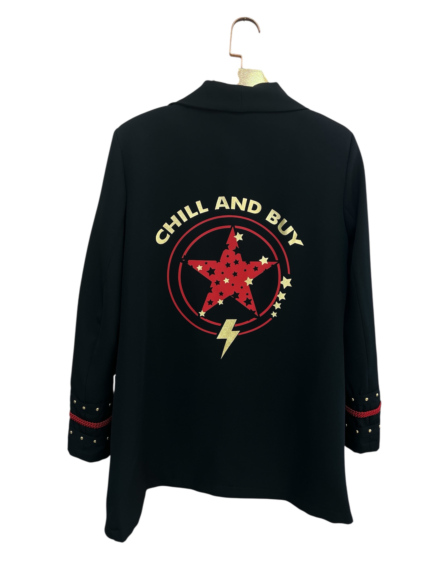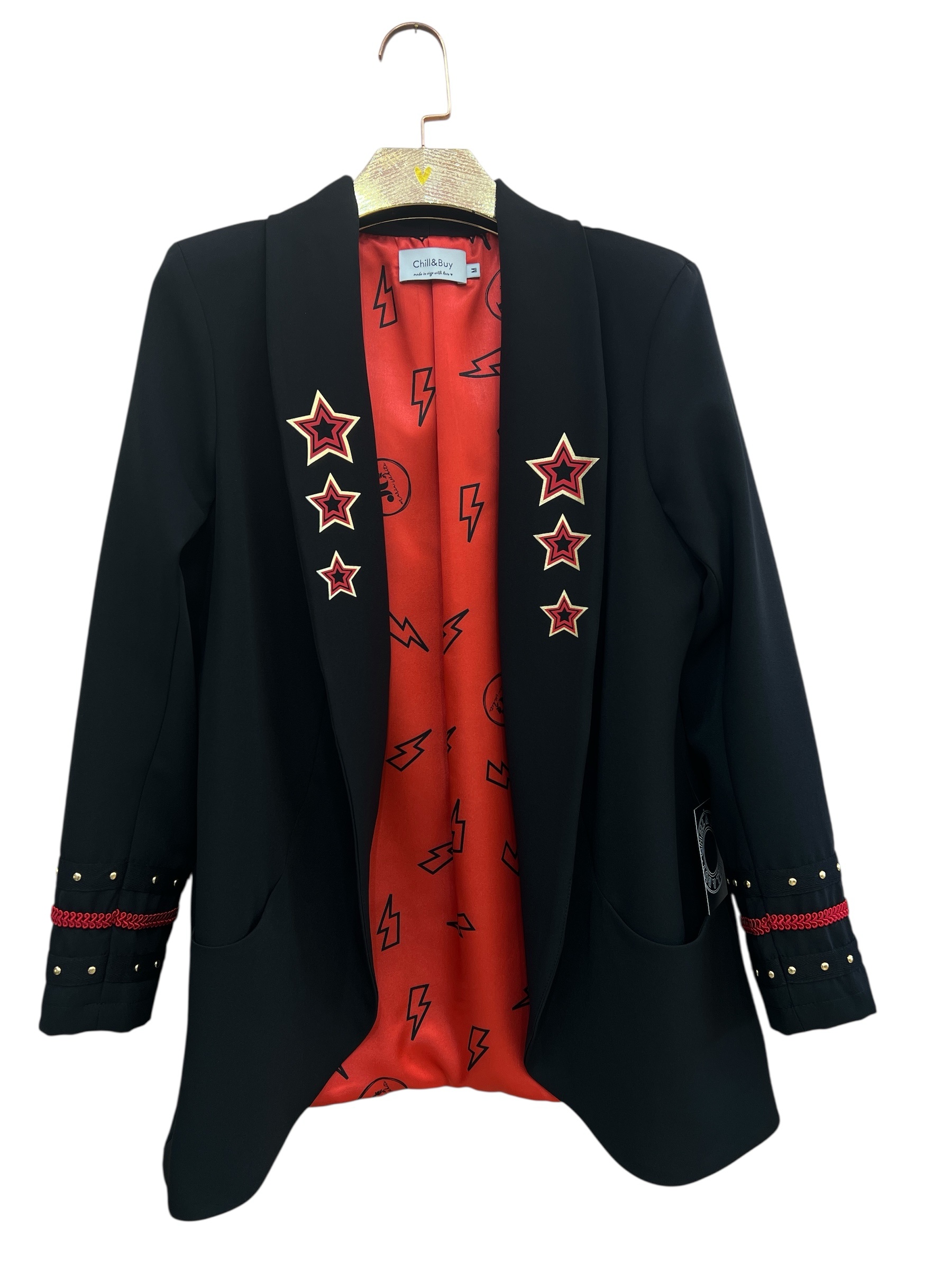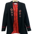 Blazer de corte smoking con forro interior y hombreras estructuradas que definen la silueta. Bolsillos funcionales y detalles decorativos en los puños que combinan galones rojos con tachuelas doradas para un toque de sofisticación. Diseño contrastante en la espalda que añade movimiento y personalidad y diseño de estrellas en las solapas delanteras.