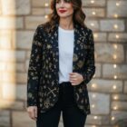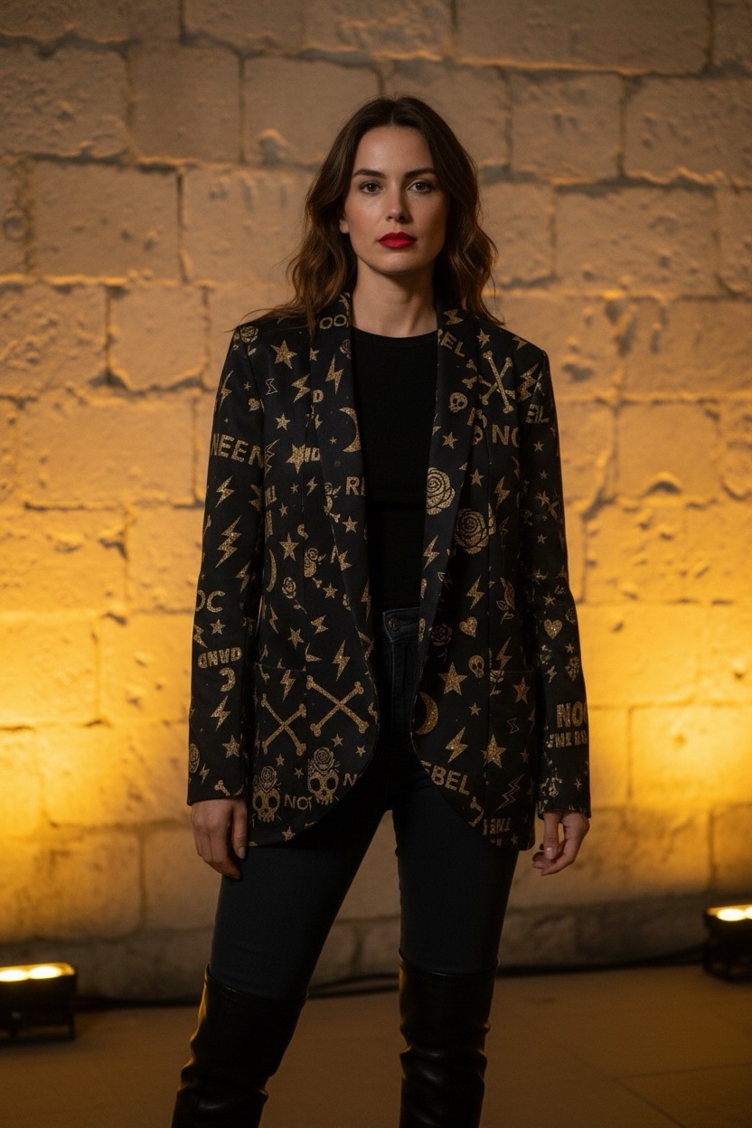 Blazer golden Rebel, perfecta para cenas y eventos navideños. Pensado para todas las clientas que buscan algo elegante para eventos navideños… pero sin perder ese toque rock y diferenciador. Súper cómoda, hobreras, bolsillos delanteros, efecto neopreno. Talla normal, coge tu talla habitual.