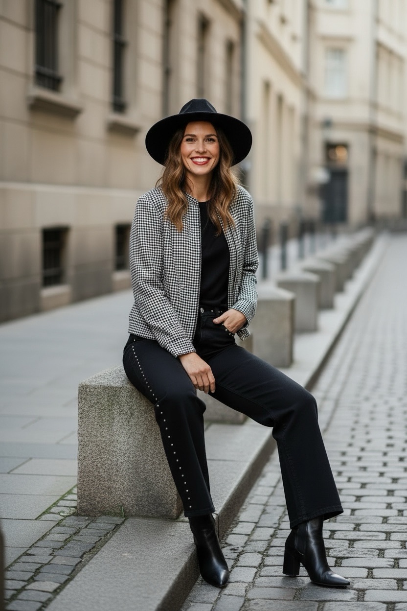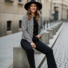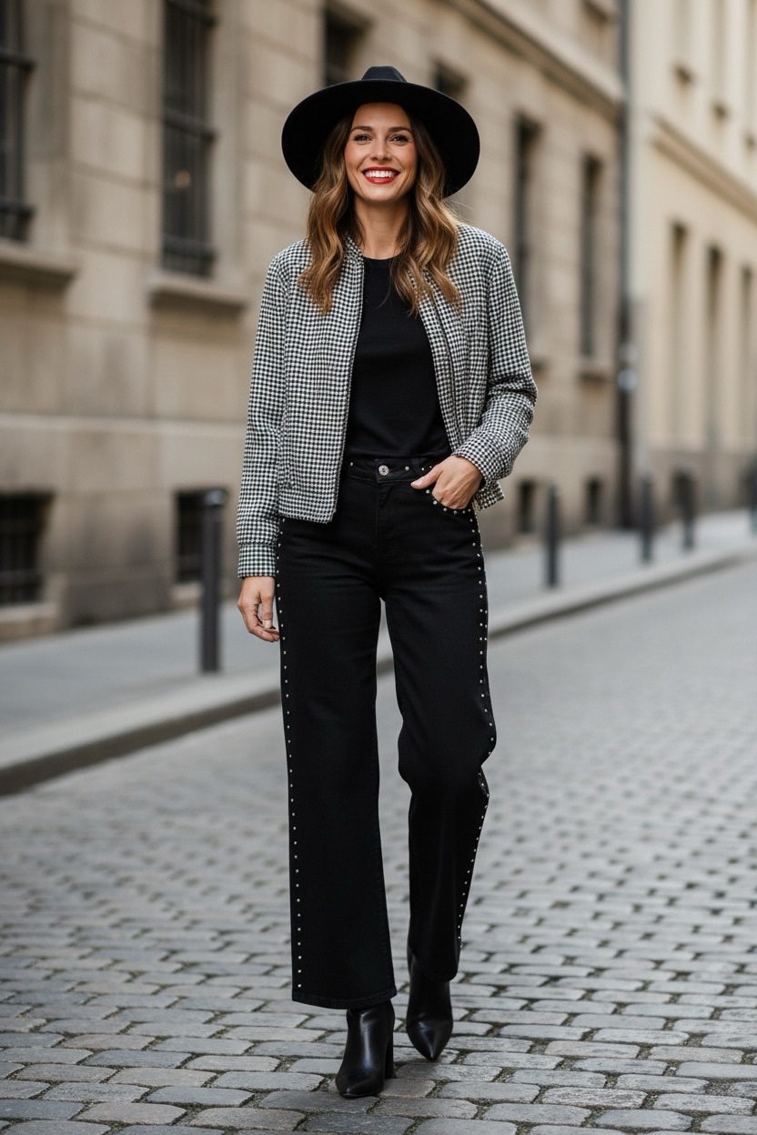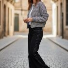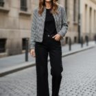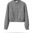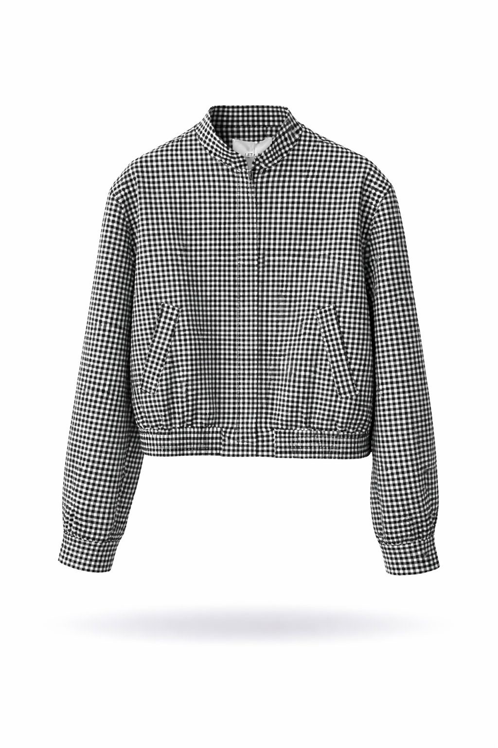 Bomber de cuadros vichy en tonos blanco y negro, cierre con cremallera y corchetes en la parte externa de la cremallera y el cierre de los puños también lleva corchetes.