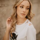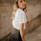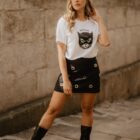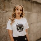 Camiseta cut out, con aberturas en los hombros en forma de nudo. En el centro: la ilustración de una gata con antifaz de super heroína. La intuición nos enseña que, a veces, la percepción y la astucia son más importantes que la fuerza bruta.