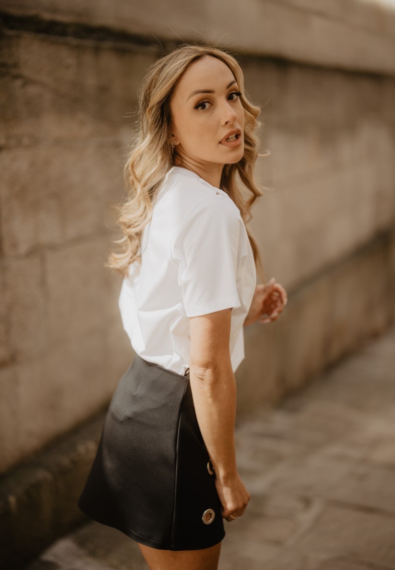 La modelo lleva una talla S y sus medidas son: altura 170, pecho 87, cintura 68 y cadera 94 cm.
