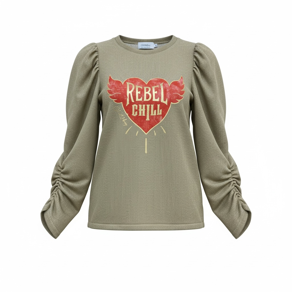 Camiseta lurex dorado, cuello redondo. Manga abullonada y fruncida. Estampado delantero.