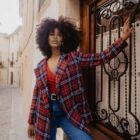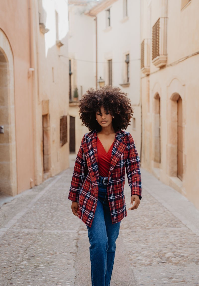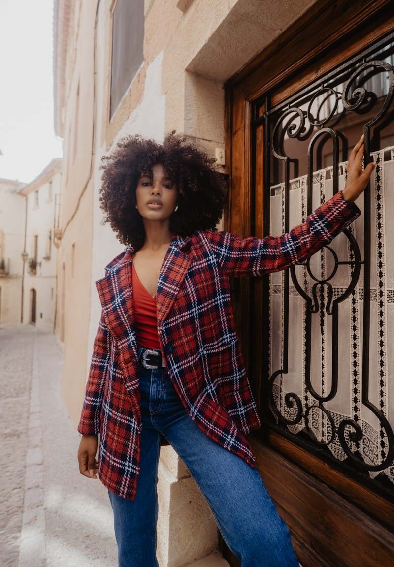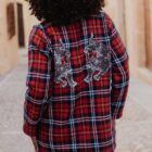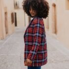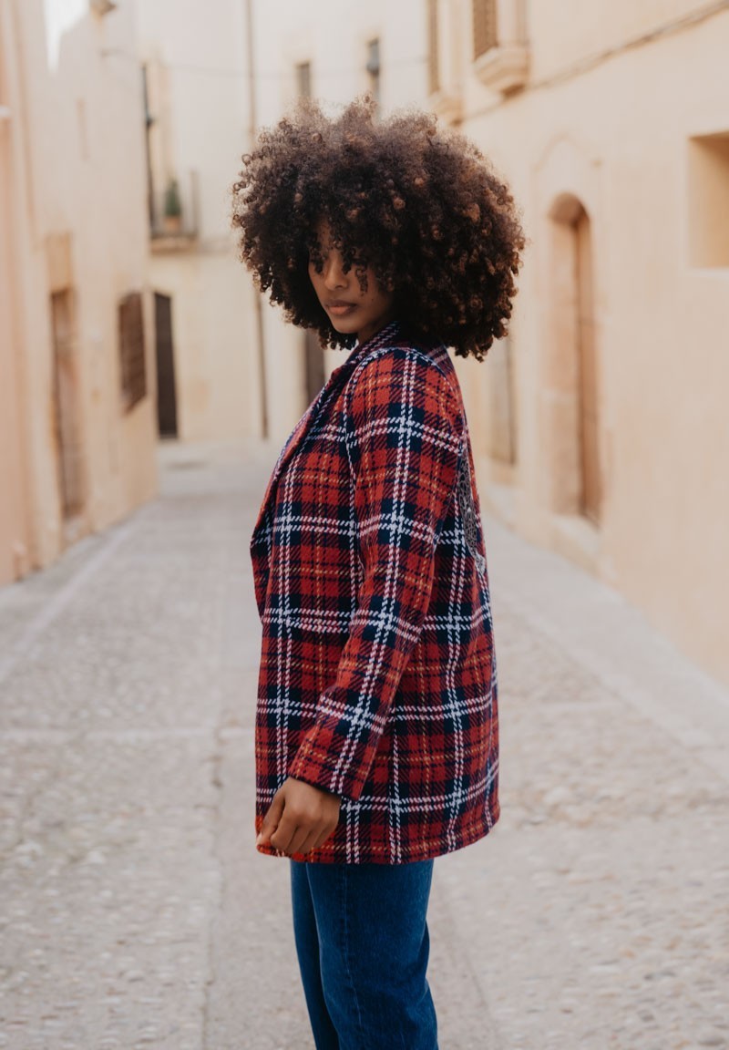 Chaqueta de cuadros con solapa, bolsillos y cierre con botón, tipo oversize. Lleva dos parches de leopardas bordados en la espalda. ¿Sabías que tanto el tartán de cuadros como el animal print pasaron de representar estatus a convertirse en símbolos de transgresión?