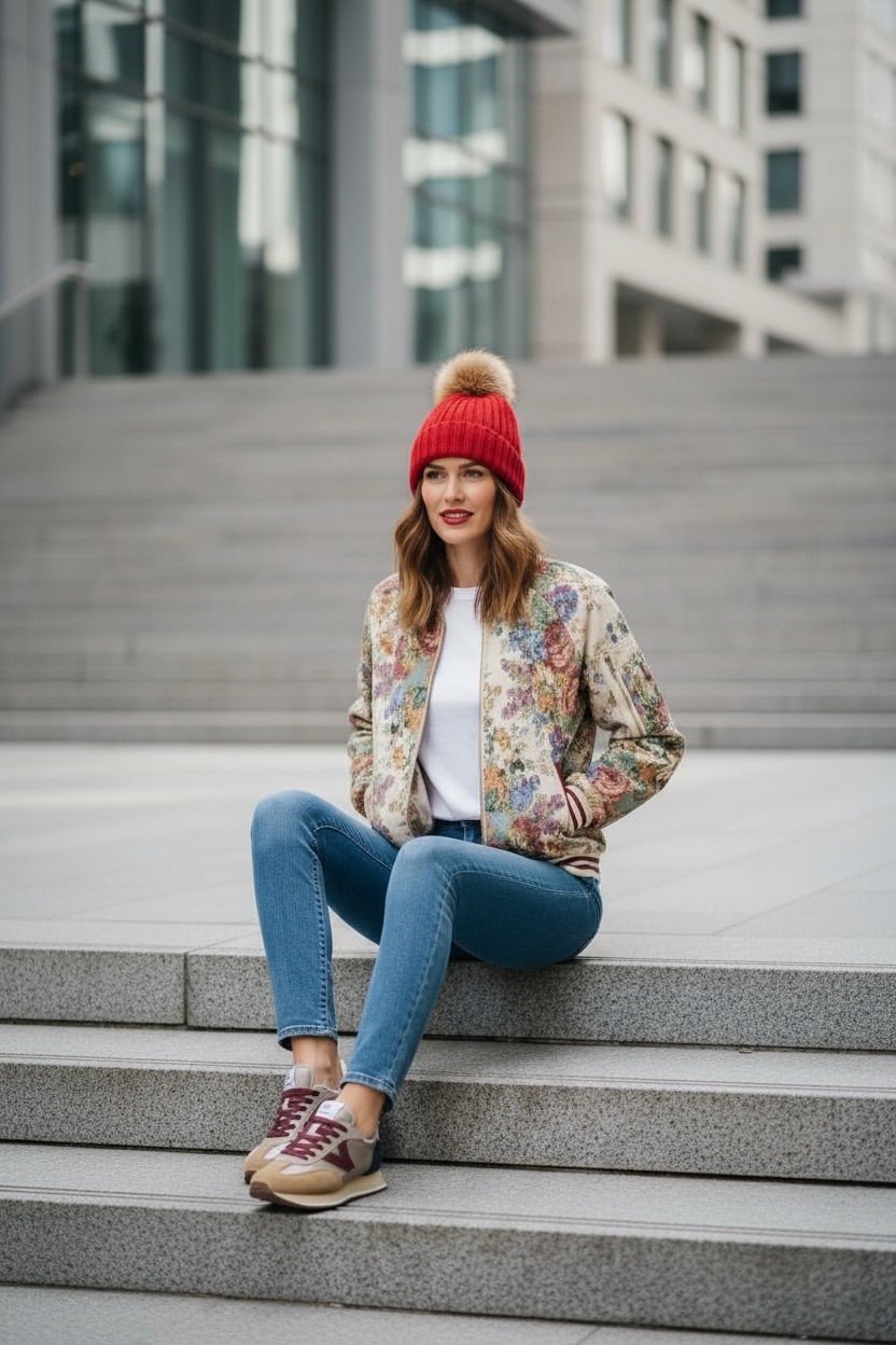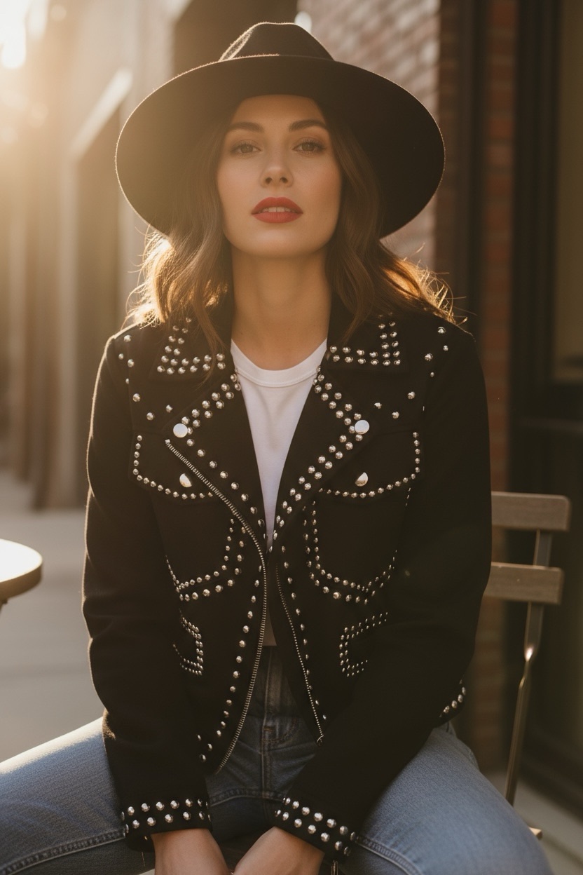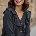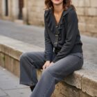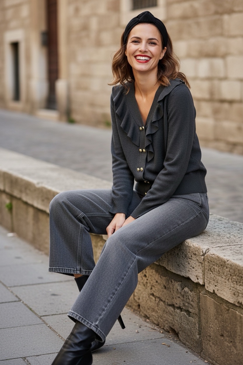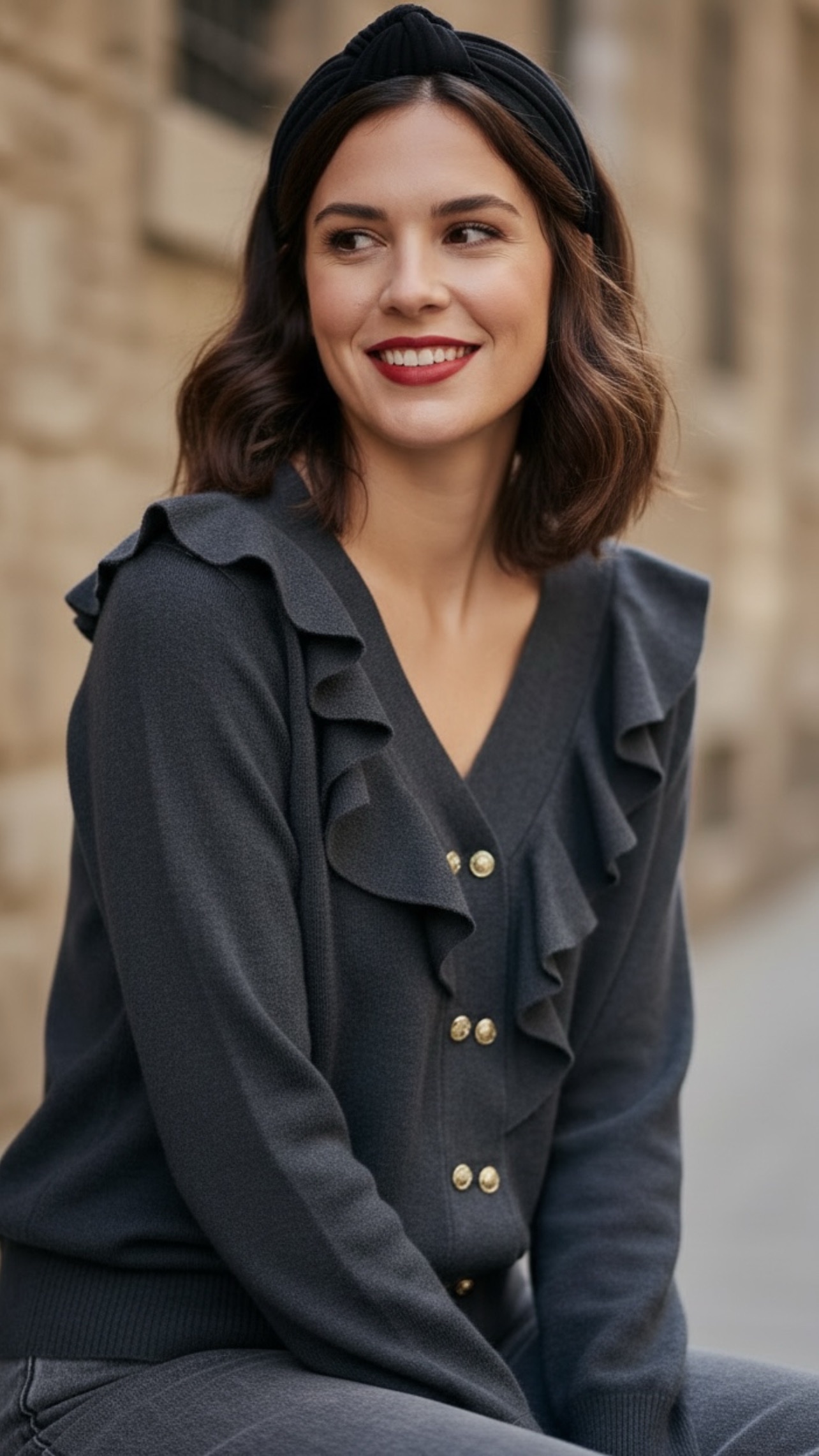 Chaqueta de punto gris oscuro, con doble fila de botones en dorado y escote en pico con volante.