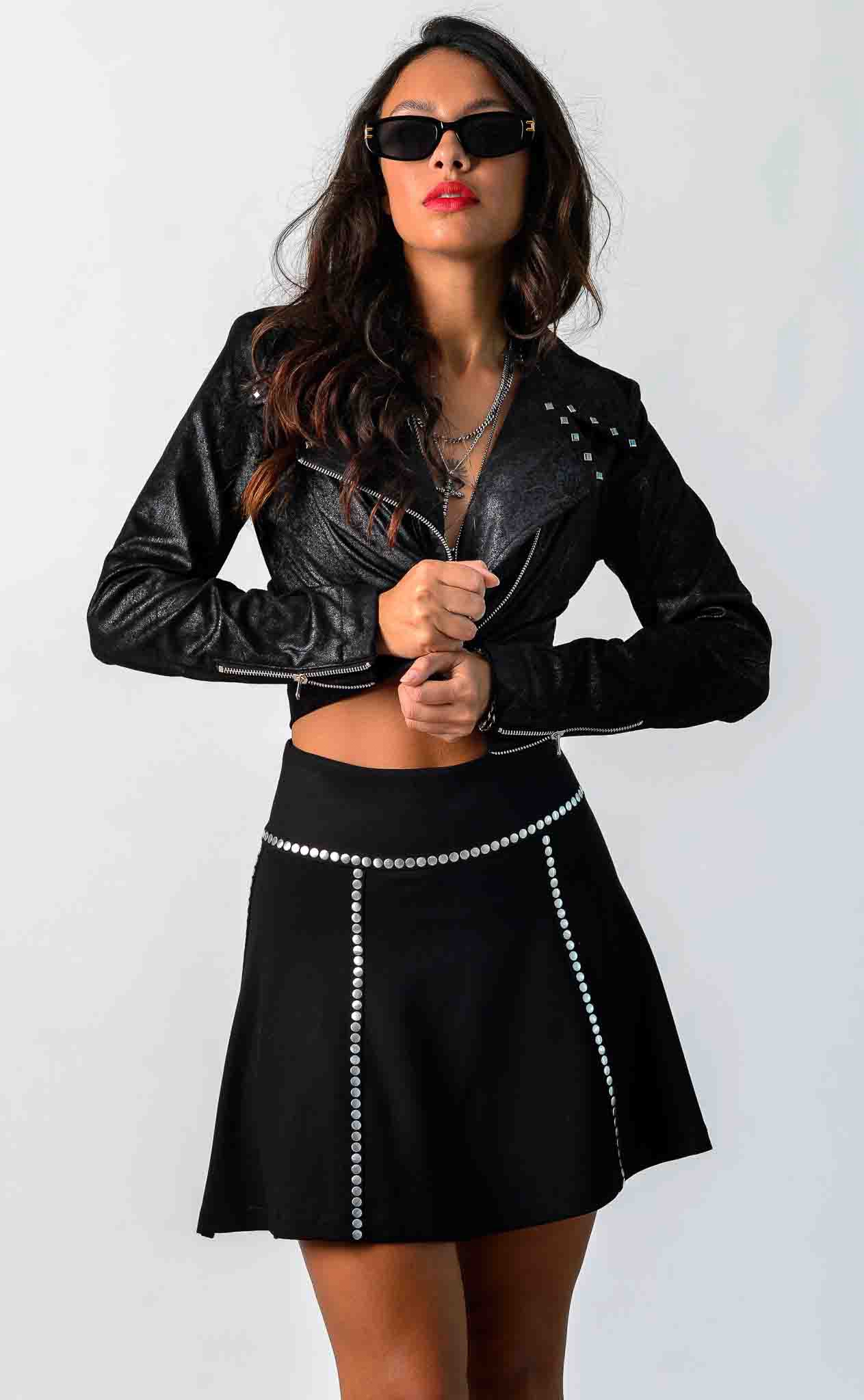 Chaqueta Biker con cierre asimétrico. Cuello y Solapa. Costuras en el delantero y la espalda que estilizan la figura. Gráfica pintado a mano en la espalda combinando serigrafía artesana con tachuelas dando un toque rockero.