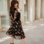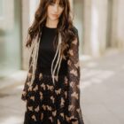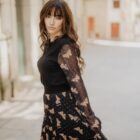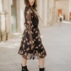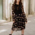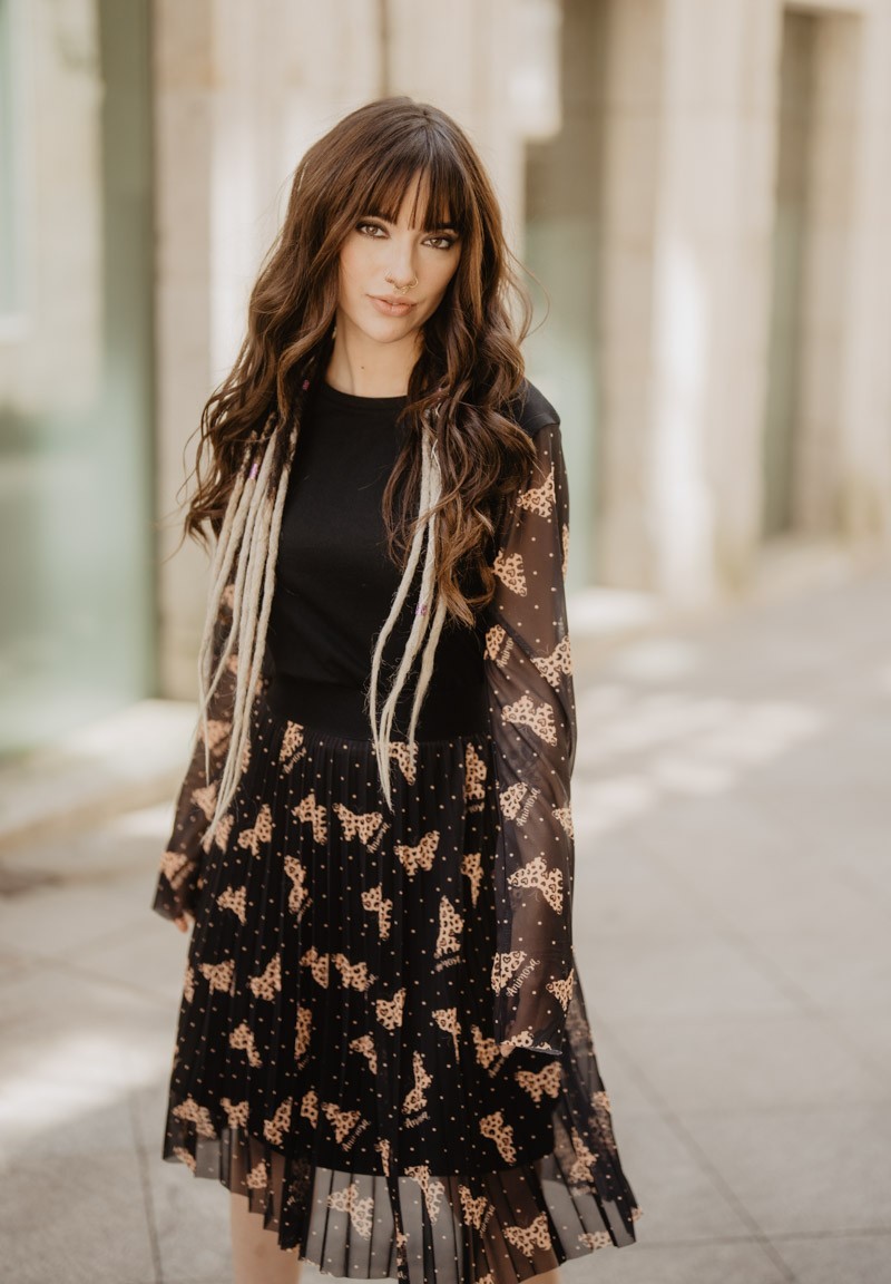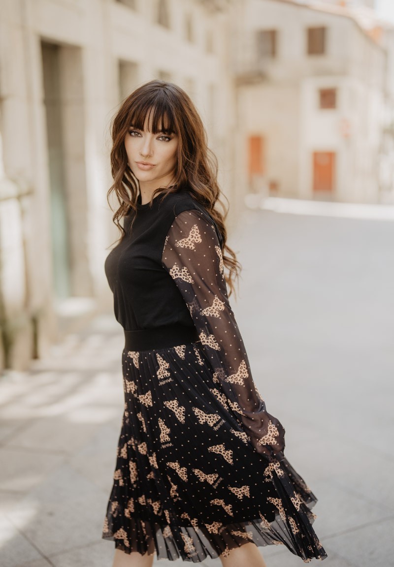 Falda plisada de tul, con goma en la cintura. El estampado está formado por pequeños lunares y mariposas de animal print.