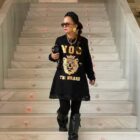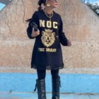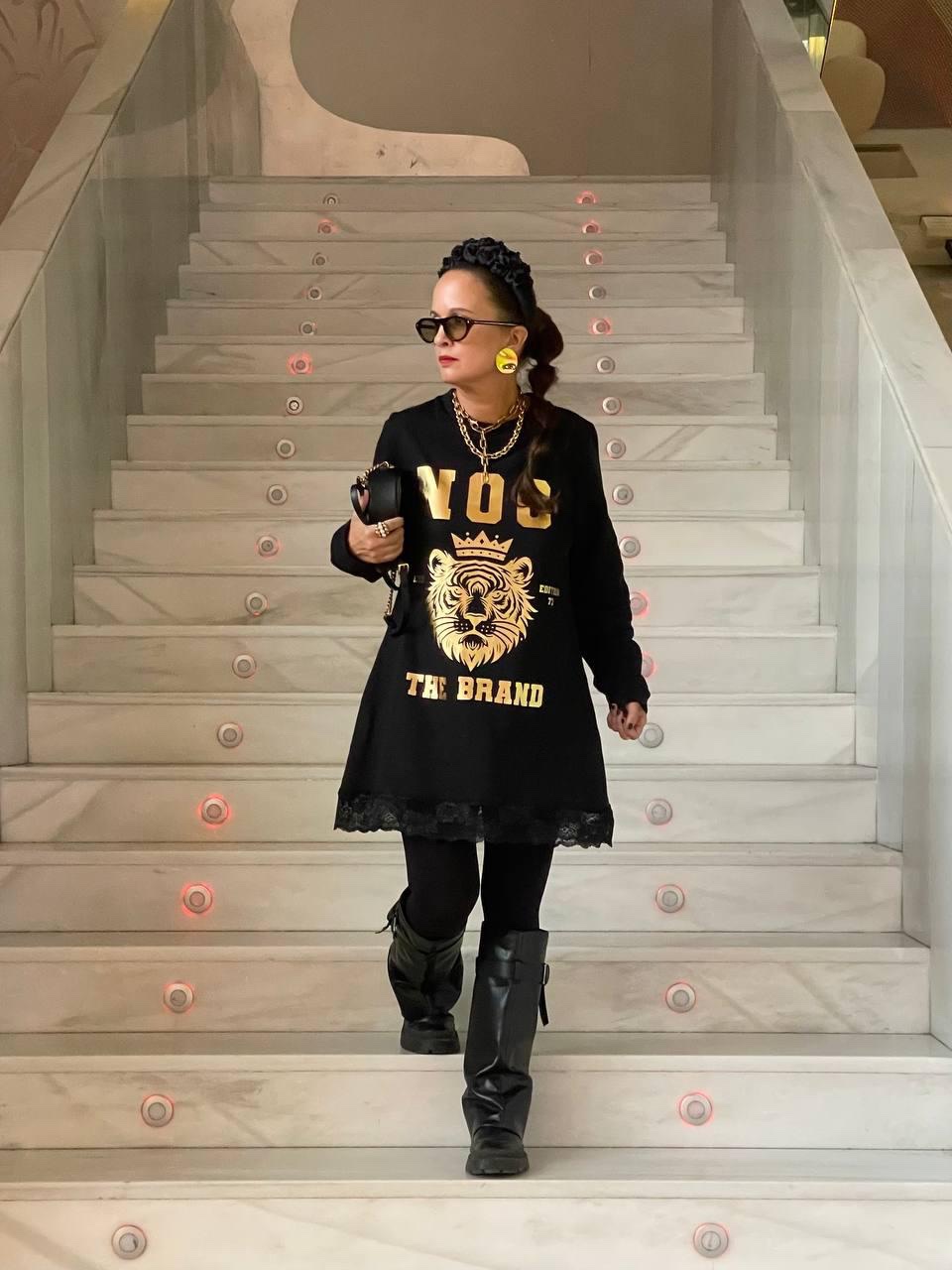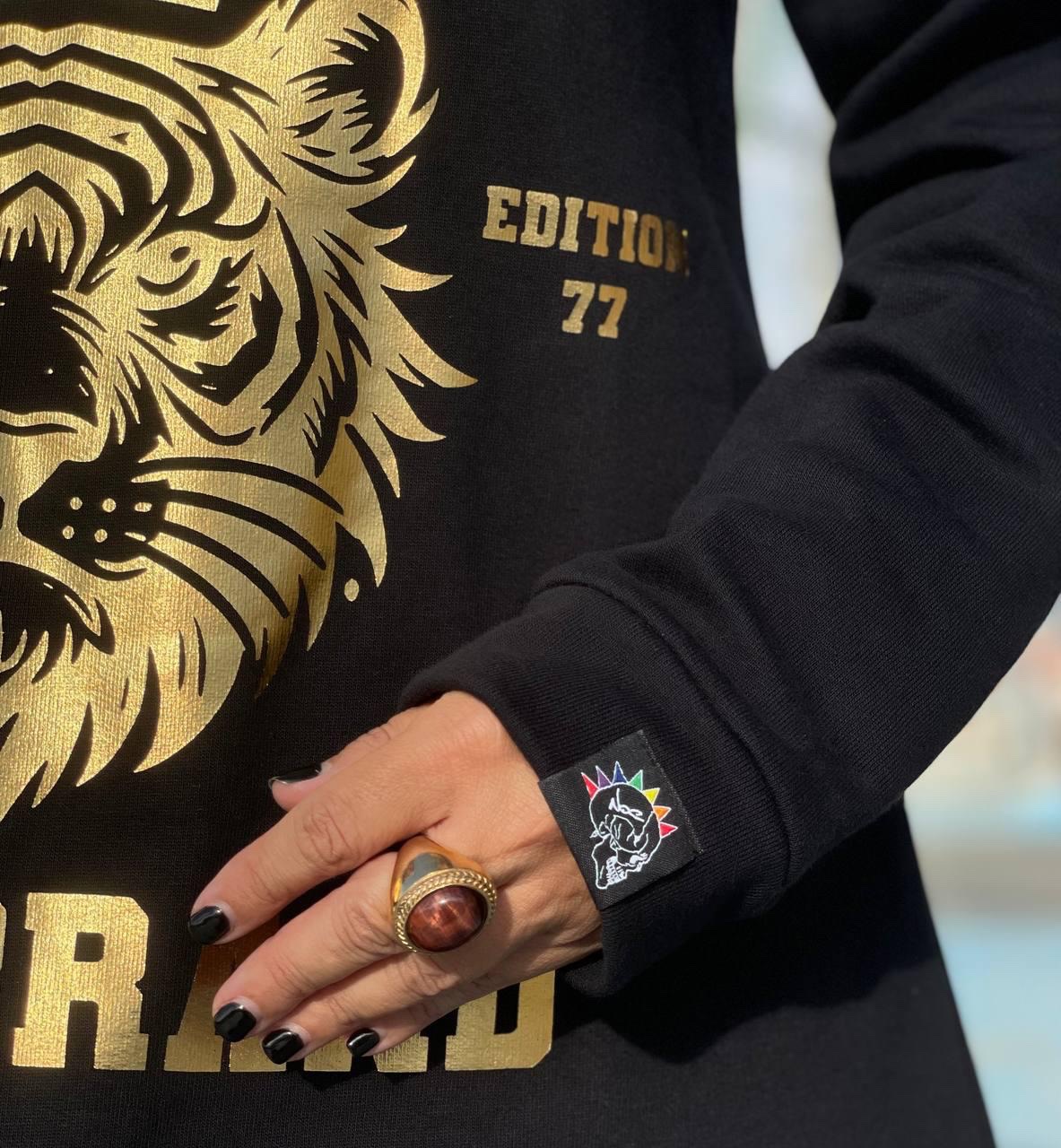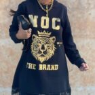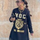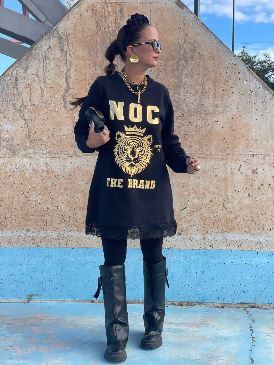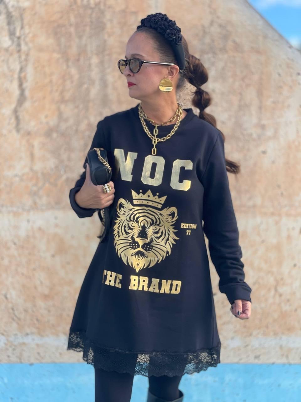 Vestido de Noc The Brand, Gold Soul – vestidazo en felpa con carda finita 100% algodón. Un vestido que combina negro con foil dorado, ideal para looks de día como de noche.