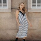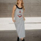 Vestido largo sin mangas, cuello marinero y escote pronunciado en la espalda. Con bolsillos. La ilustración del centro está delicadamente bordada: una calavera marinera sobre un ancla. Es reversible: puedes llevarlo con el escote en el delantero y la ilustración en la espalda.