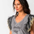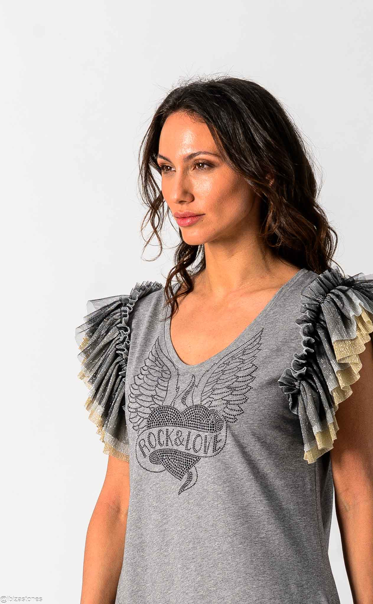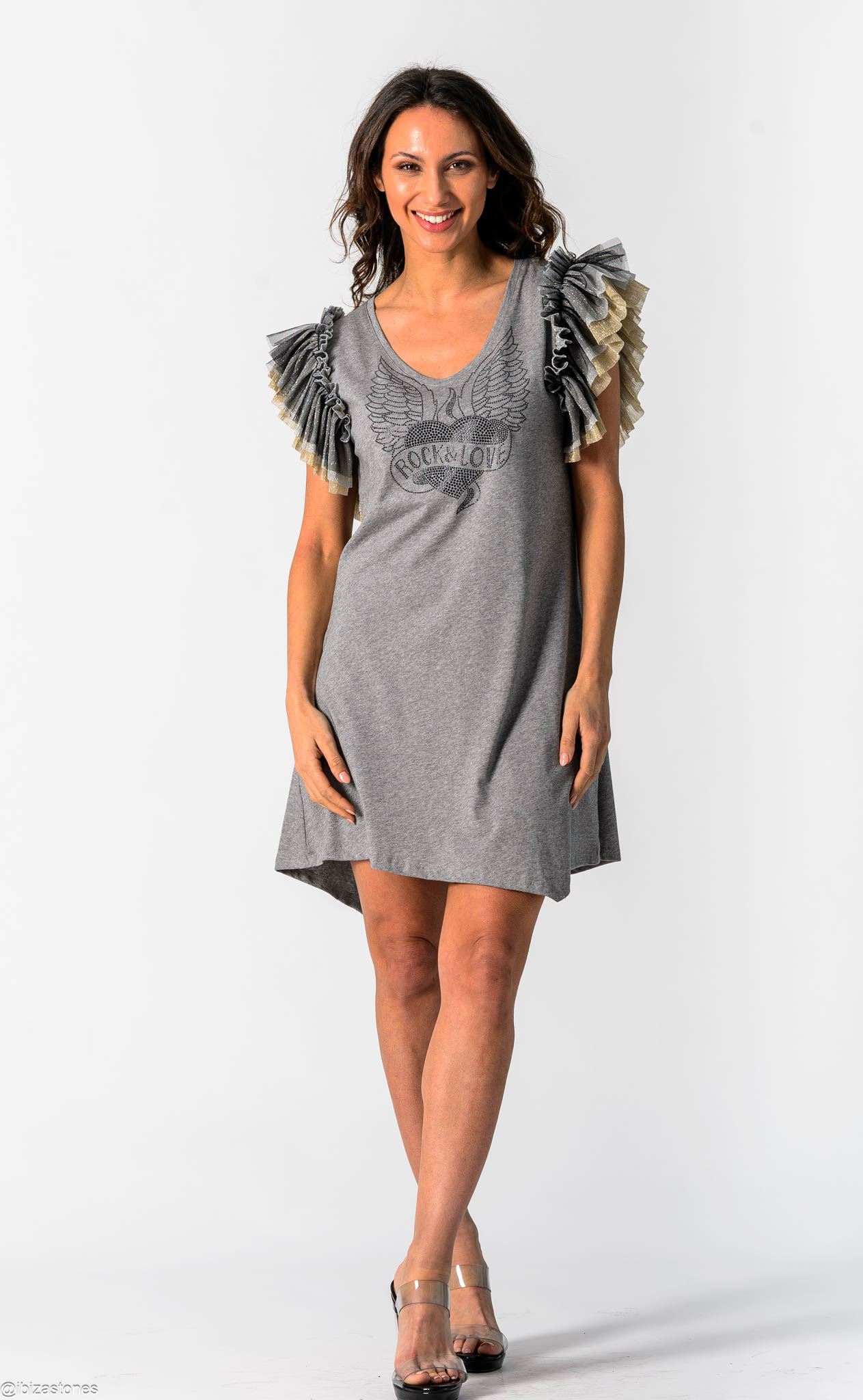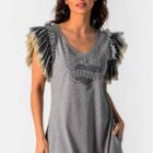 Vestido evasé con bajo asimétrico, mangas en distintos tejidos y un gráfico de pedrería que captura la esencia rebelde. Un look poderoso para brillar con actitud cada día.
