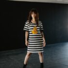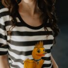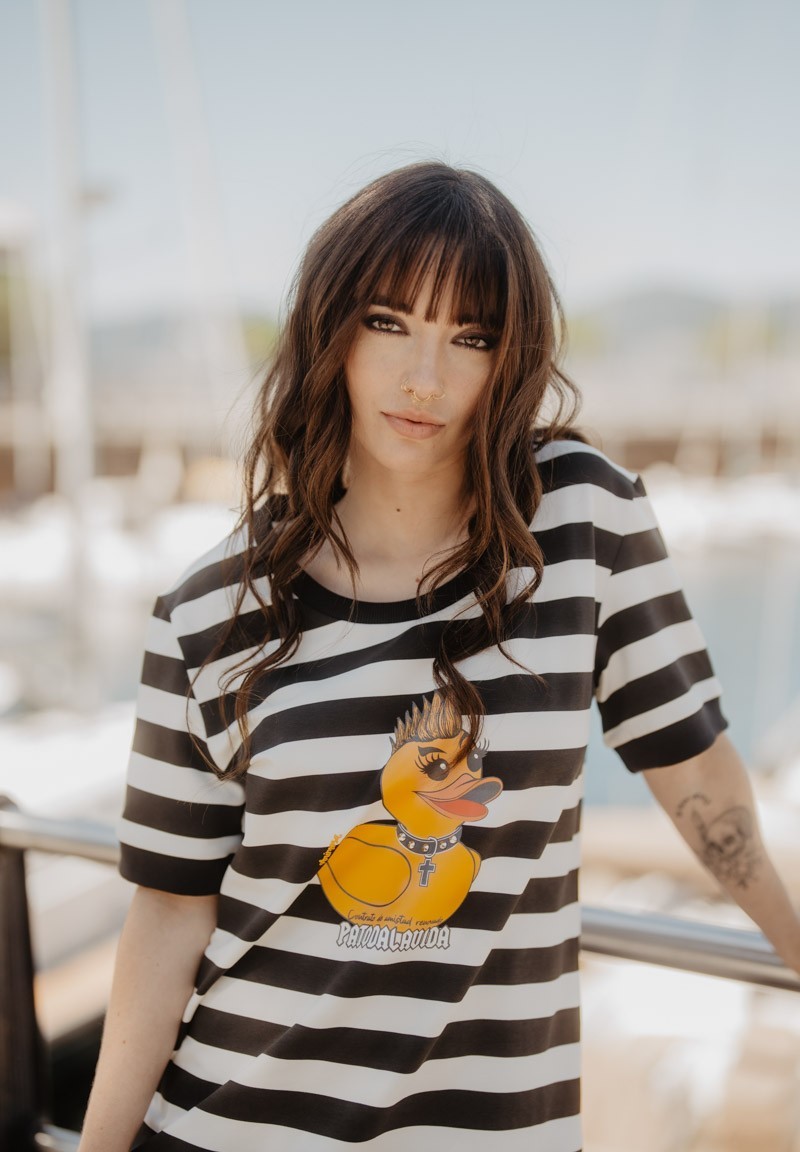 Vestido de rayas con la ilustración de una pata de goma punk, con tachuelas reales en el collar. La palabra Animosa bordada en la espalda. El diseño es un guiño divertido a la amistad entre mujeres, que cultivamos y los mantenemos a largo plazo, “patodalavida”.
